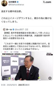 「自民党も立民も数合わせをやっている。そんなこと、この世界にいたら当たり前だ。理念は大事だが、きれい事でごまかしているうちは本当ではない」と述べた。