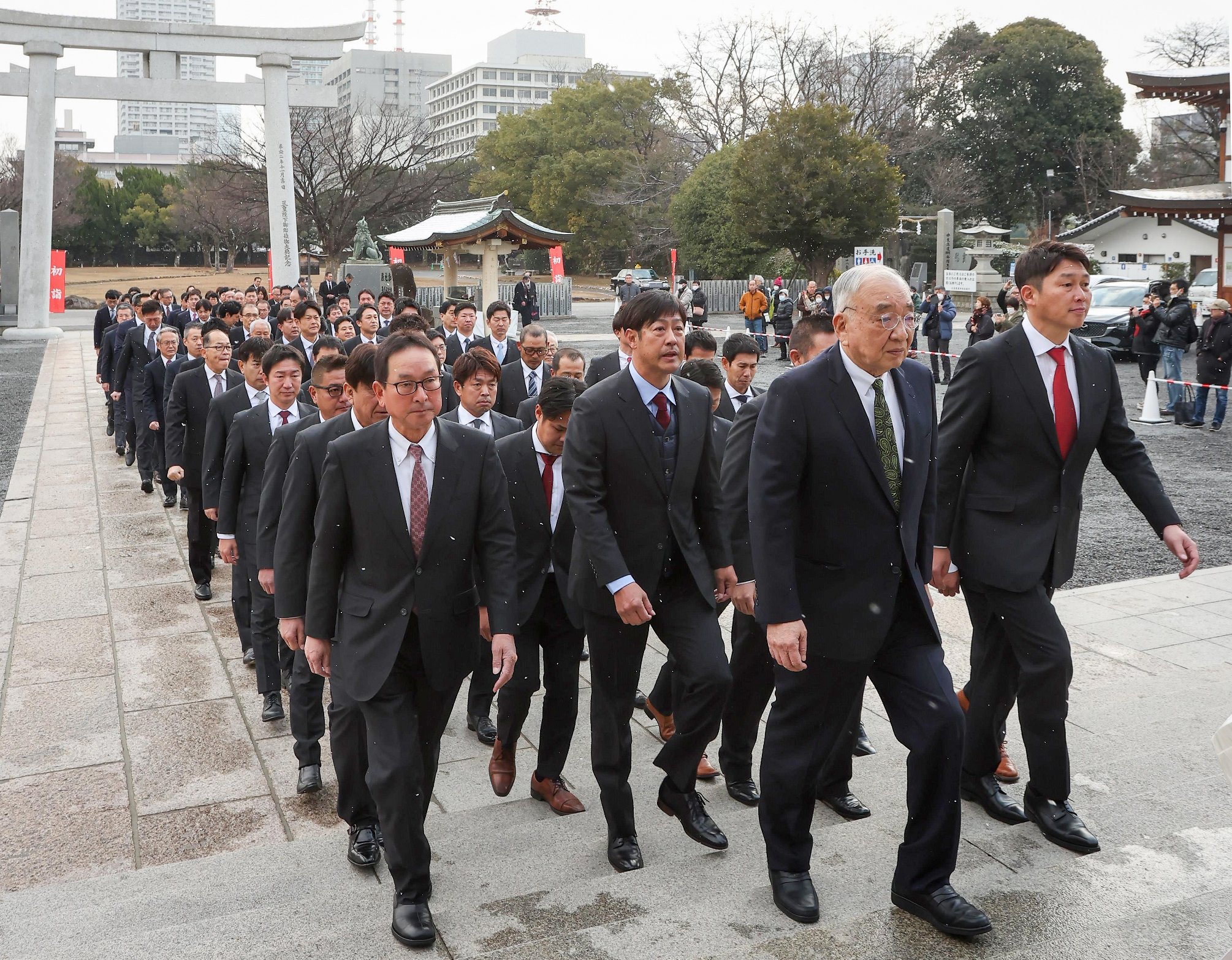 午前10時、雪がちらつく中、首脳陣と球団職員の計約90人がスーツ姿で参拝。松田元オーナーと新井貴浩監督が玉串を奉納した。