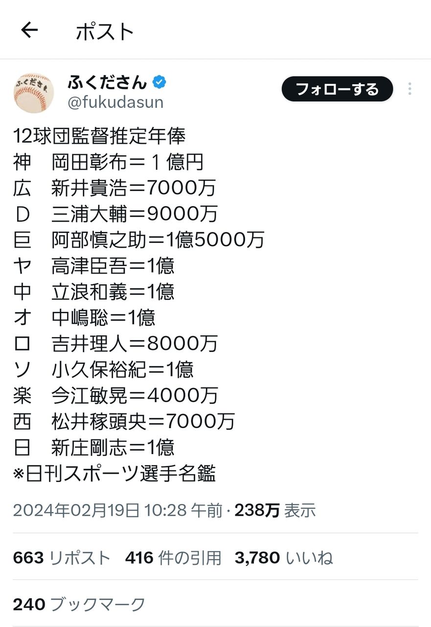 日 新庄剛志=1億…— ふくださん (@fukudasun) February 19, 2024