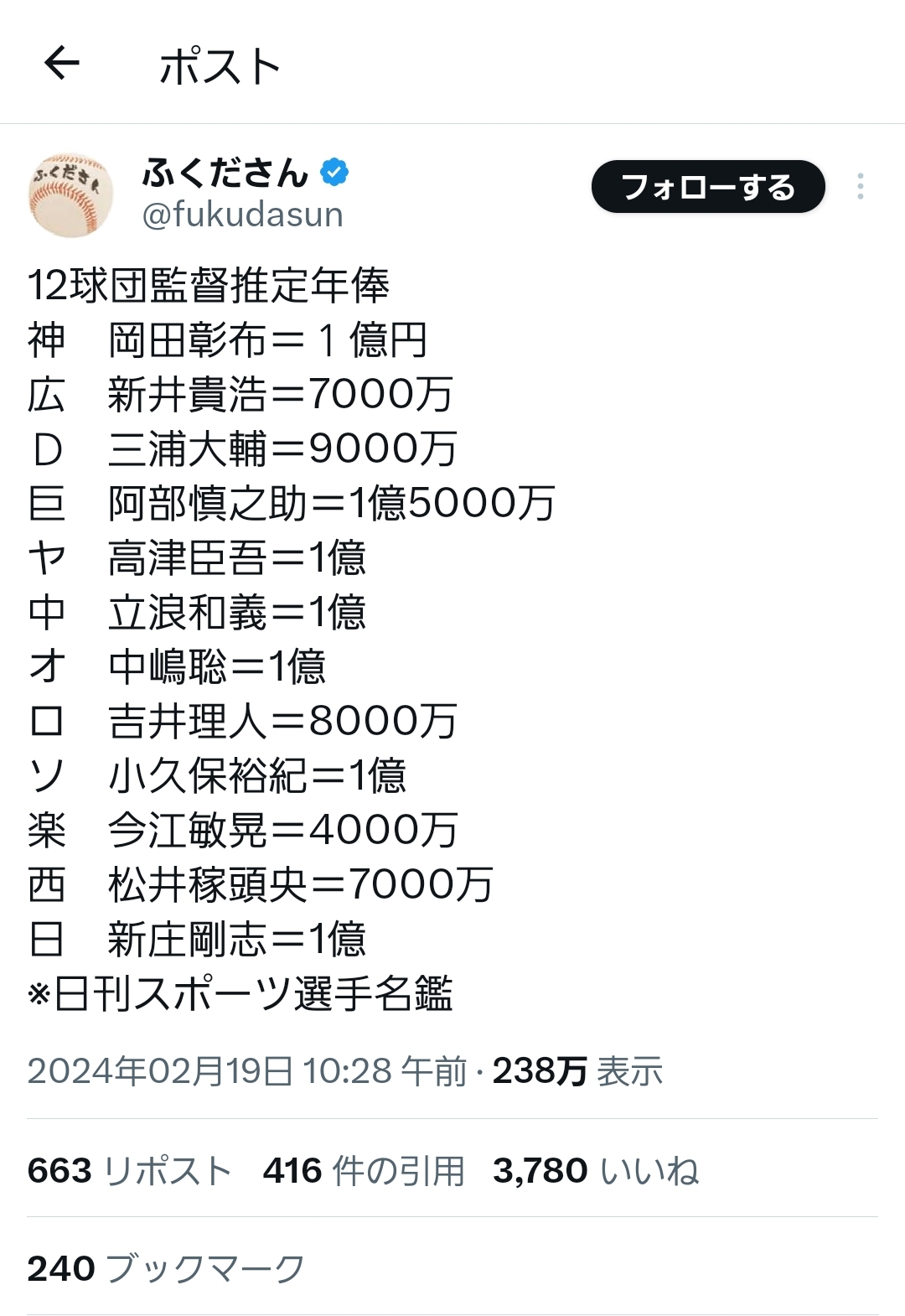 12球団の監督年俸!新井0.7億!岡田&立浪&高津1億!阿部1.5億!三浦0.9億!