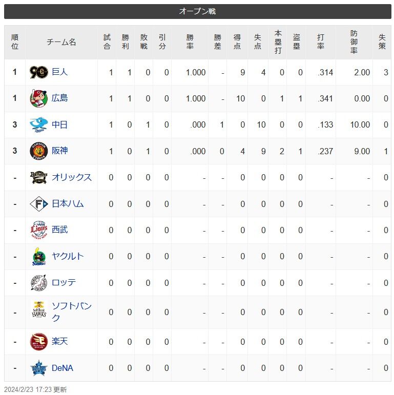 オープン戦順位表(2/23)wxwxwxwxwxwxwxwxwxwxwxwxw