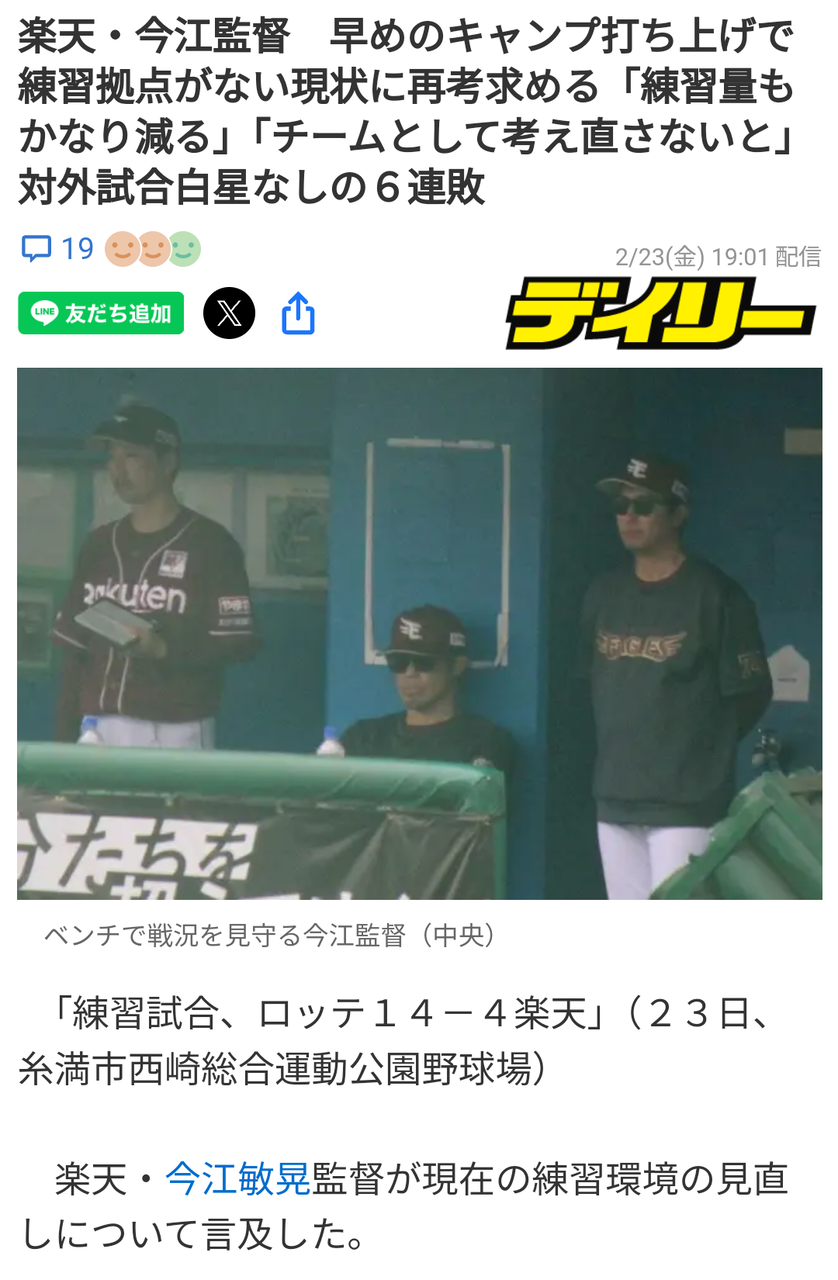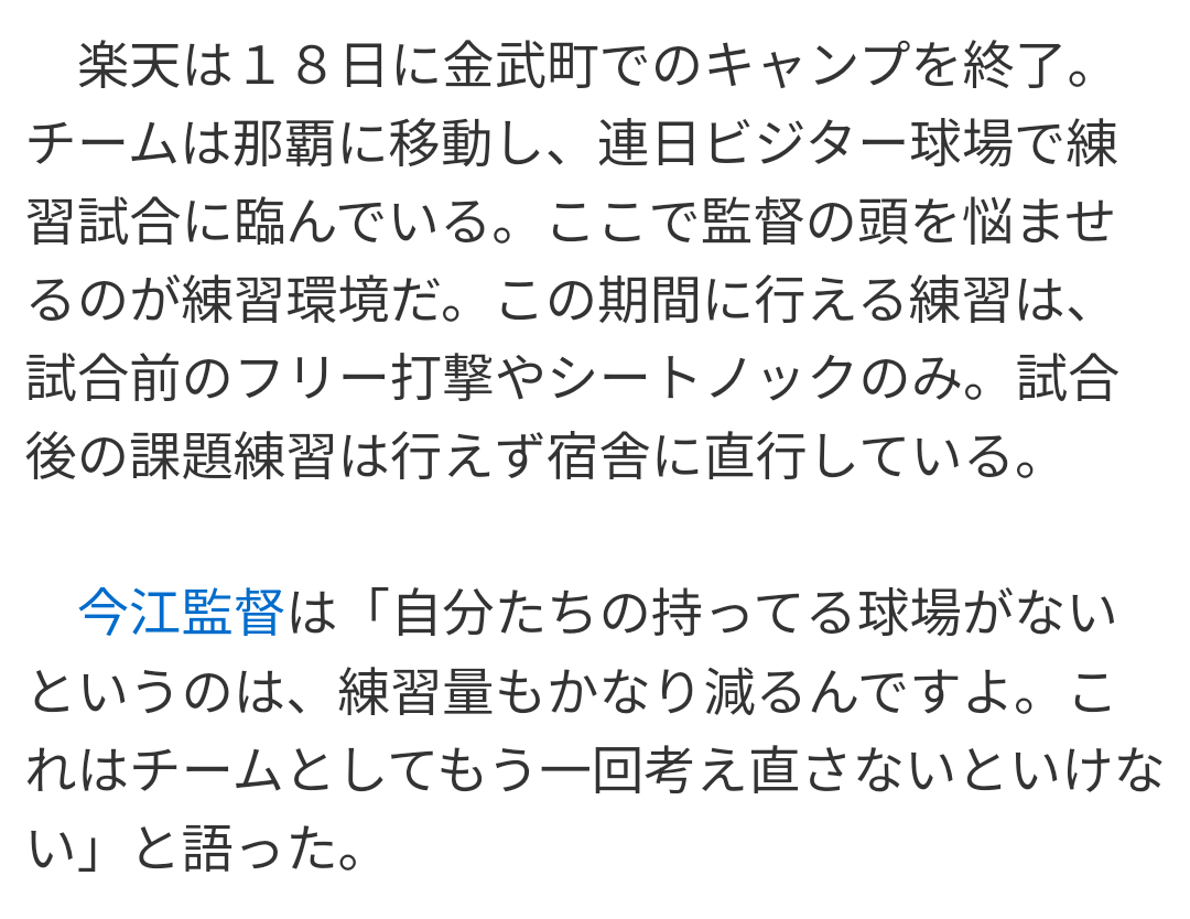 楽天今江監督「キャンプを早く打ち上げたので練習する場所がなくて困ってる。練習できない。考えないと」