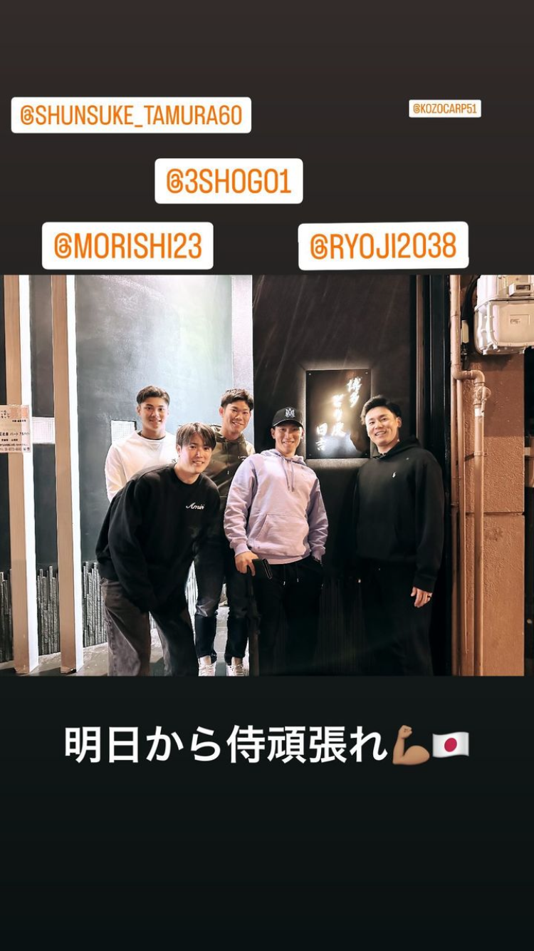 西川の投稿に登場したのは、森下暢仁、坂倉将吾、栗林良吏、田村俊介の広島4人衆。西川は侍ジャパンに選出された4人を食事に紹介した模様で「明日から侍頑張れ」というメッセージをともに、5ショットを公開。森下、坂倉、栗林、田村もそれぞれインスタグラムのストーリーで返信した。