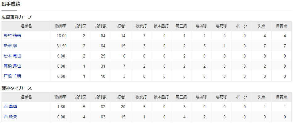 カープ2軍開幕戦、阪神に13失点で大敗_投手成績