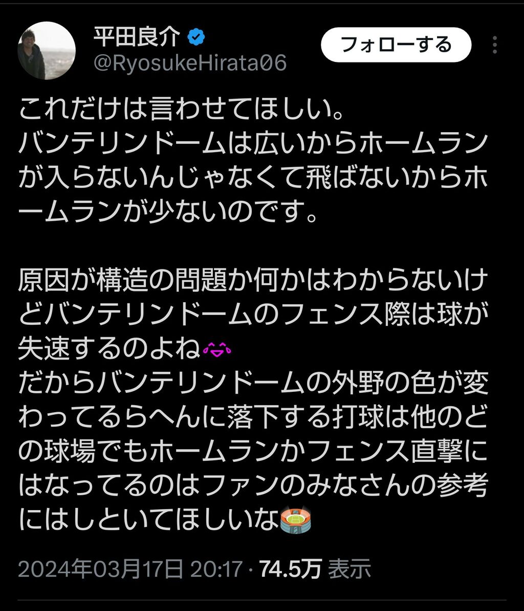 バンテリンドームは広いからホームランが入らないんじゃなくて飛ばないからホームランが少ないのです。原因が構造の問題か何かはわからないけどバンテリンドームのフェンス際は球が失速するのよね😂…