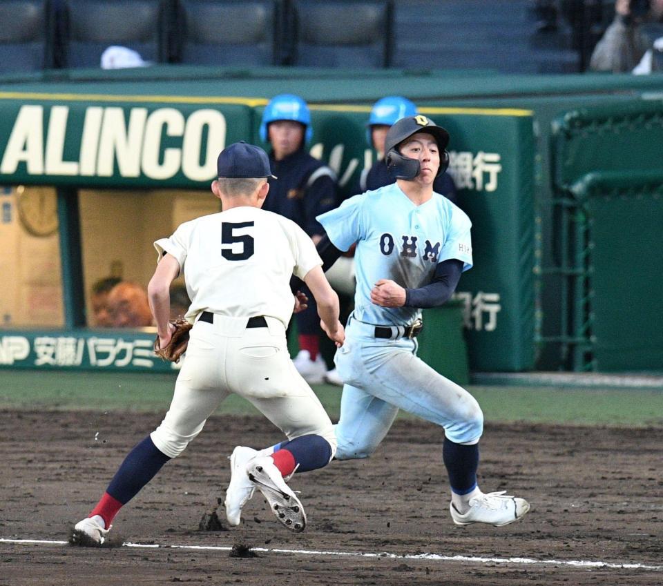 八回、挟殺プレーで近江の三塁走者がファウルグラウンドによけるようにして逃げた場面。判定はアウトにならなかったが、坂井氏は「この場合、野手は走者に届かなくてもいいので、タッグ(タッチ)行為をしていれば、間違いなくアウトになっていたプレイです。日本の高校野球では、動画のようになぜかタッグ行為をしない選手が多くいます」と、説明した。