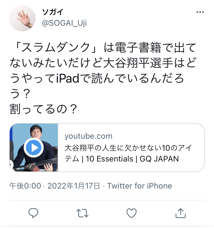 【悲報】大谷翔平さん、嘘つきだった‥電子書籍化されてないスラムダンクをipadで読んでると発言wwwwwww