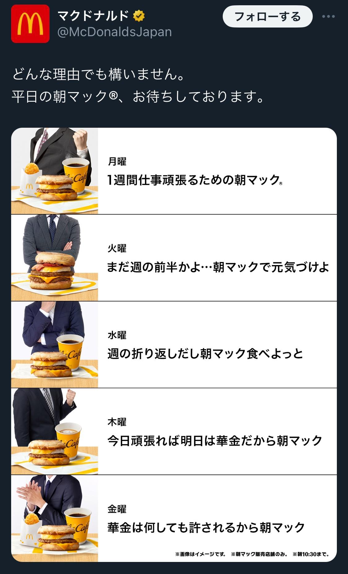 【朗報】マクドナルド公式「朝マック、お待ちしております。」