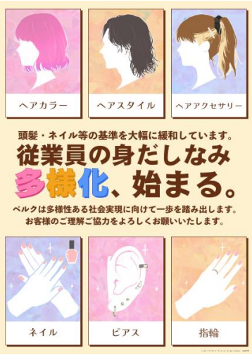 スーパーマーケットの店頭に掲げられたポスターが話題になっています。「従業員の身だしなみ 多様化、始まる。頭髪・ネイル等の基準を大幅に緩和しています。お客様のご理解ご協力をよろしくお願いいたします」。こう打ち出したのは、首都圏に135店舗を展開する「株式会社ベルク」。約8880人いる従業員の多様性や個性を尊重し、男女問わず、勤務中の髪色やアクセサリー、ネイルカラーなどの基準を緩和するというものです。同社では9月1日から、勤務中の髪色と髪型が自由になり、ヘアアクセサリーとピアスも装着可能に。指輪は突起がないもの、ネックレスは衣服の上に掛からなければOK。また、付け爪はこれまで通り禁止ですが、ネイルカラーは認められるようになりました。いずれも「常に衛生的かつ清潔であり、お客様に不快感や恐怖感を与えないこと。作業性と安全性を考慮し、業務に支障を与えないこと」が前提条件です。