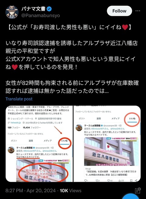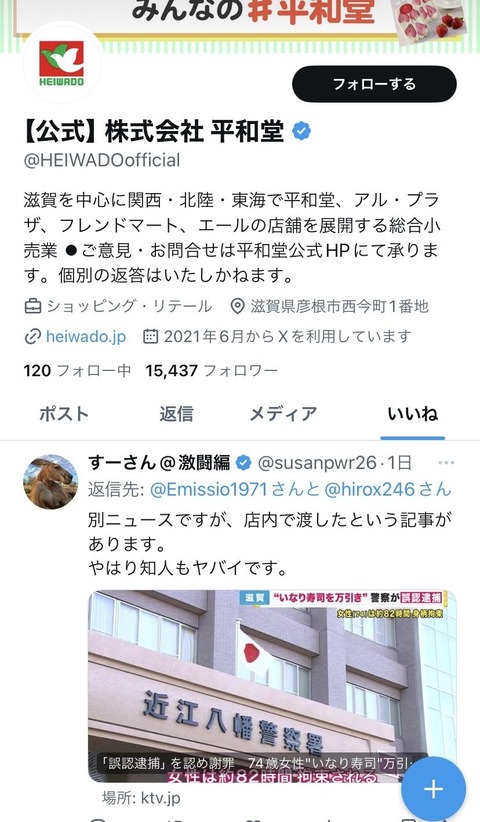 いなり寿司万引き誤認逮捕事件、平和堂が見解発表「店内で渡した知人が悪い」X投稿にいいねをつけてしまうwwwwwww