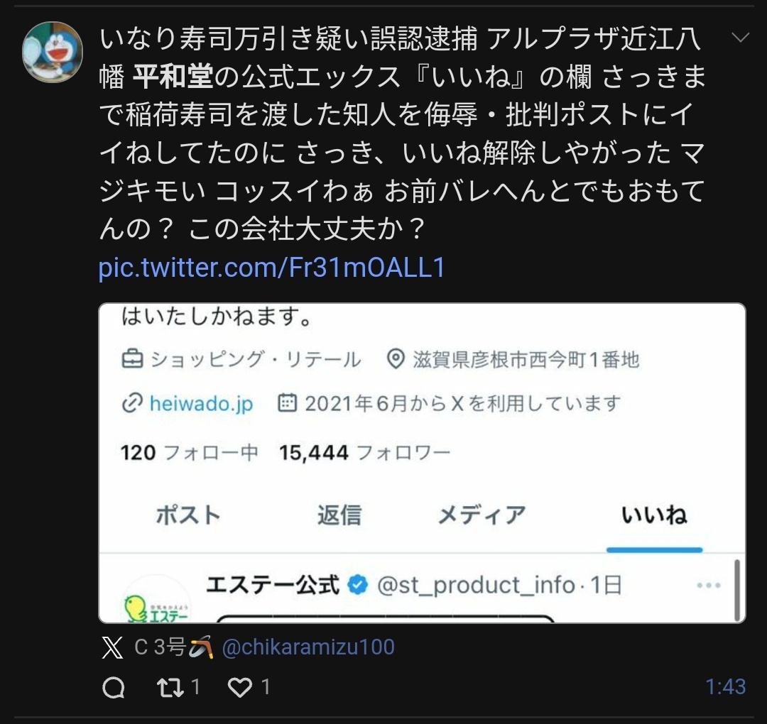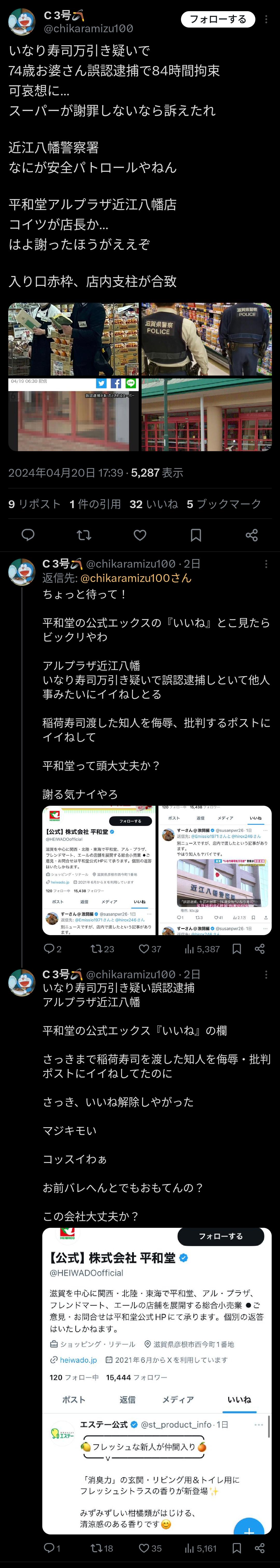 いなり寿司万引き誤認逮捕事件、平和堂が見解発表「店内で渡した知人が悪い」X投稿にいいねをつけてしまうwwwwwww