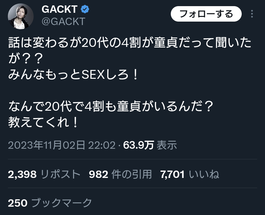 GACKT「なんで20代で4割も童貞がいるんだ?教えてくれ!」