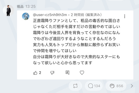 【悲報】粗品「自殺するわ」とSNSに投稿 2023年11月4日 最終更新日時 : 2023年11月4日 loki.5ch.net カープドラ6西川篤夢!「日本を代表する遊撃手になりたい」【ドラフト会議2025】 カープドラ5赤木晴哉!191cm最速153キロ!佛教大の本格派右腕!【ドラフト会議2025】 カープドラ4工藤泰己!159キロ北の剛腕!【ドラフト会議2025】 カープドラ3勝田成!近畿大163cmセカンド!菊池涼介の後継者候補!【ドラフト会議2025】 カープドラ2齊藤汰直!亜大152キロエース!【ドラフト会議2025】 カープドラ1平川蓮!187cmのスイッチヒッター!立石正広を外し2度目の重複も新井監督がクジを引き当てる!【ドラフト会議2025】 【カープ実況】ドラフト会議2025!ドラ1立石正広の獲得なるか 緒方孝市カープドラ3指名で青学出禁!澤﨑俊和の逆指名まで10年間スカウト出禁 【朗報】広島、攻守最強都市だったwww 【悲報】彼女「ごめん!俺くんの貯金、情報商材に使っちゃった」→…問い詰めたらギャン泣きされたんだが俺が悪いのか? 【悲報】粗品「自殺するわ」とSNSに投稿 1:それでも動く名無し:2023/11/03(金) 22:50:30.05 ID:R0oDCxsK0 自分の理想を押し付けてくるファンのコメントを晒す ↓ それに対してコメントして来た人への反論 2:それでも動く名無し:2023/11/03(金) 22:51:45.17 ID:UtE2QLP+0 ダサすぎて草 4:それでも動く名無し:2023/11/03(金) 22:52:37.87 ID:kYMJDg8c0 こいつ最近おかしいよな 続きを読む 続きを見る カープドラ6西川篤夢!「日本を代表する遊撃手になりたい」【ドラフト会議2025】 カープドラ5赤木晴哉!191cm最速153キロ!佛教大の本格派右腕!【ドラフト会議2025】 カープドラ4工藤泰己!159キロ北の剛腕!【ドラフト会議2025】 カープドラ3勝田成!近畿大163cmセカンド!菊池涼介の後継者候補!【ドラフト会議2025】 カープドラ2齊藤汰直!亜大152キロエース!【ドラフト会議2025】 カープドラ1平川蓮!187cmのスイッチヒッター!立石正広を外し2度目の重複も新井監督がクジを引き当てる!【ドラフト会議2025】 【カープ実況】ドラフト会議2025!ドラ1立石正広の獲得なるか 緒方孝市カープドラ3指名で青学出禁!澤﨑俊和の逆指名まで10年間スカウト出禁 関連記事 関連記事はありません。
