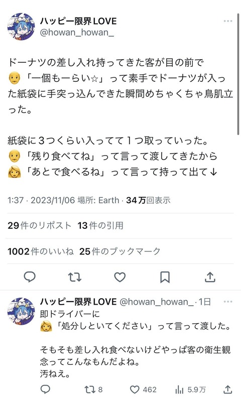 【悲報】風俗嬢さん、客の男性器は舐めれても差し入れのドーナツは食べれない