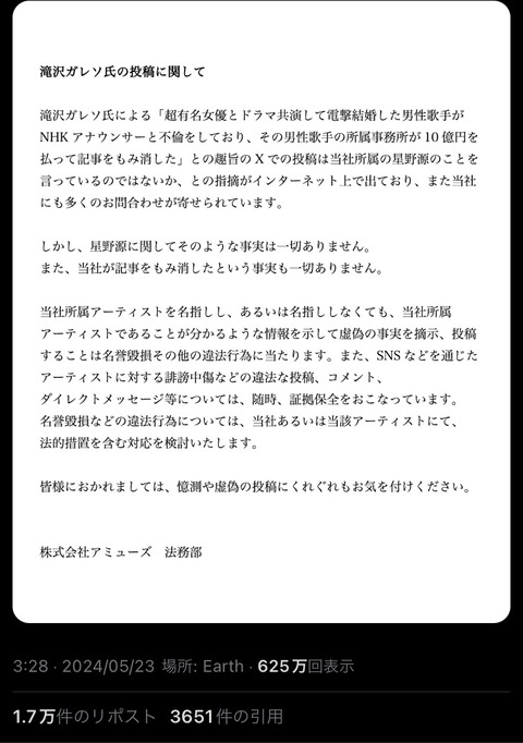 滝沢ガレソ、深夜3時半に星野源の事務所に声明を出させるwwwwwwwww