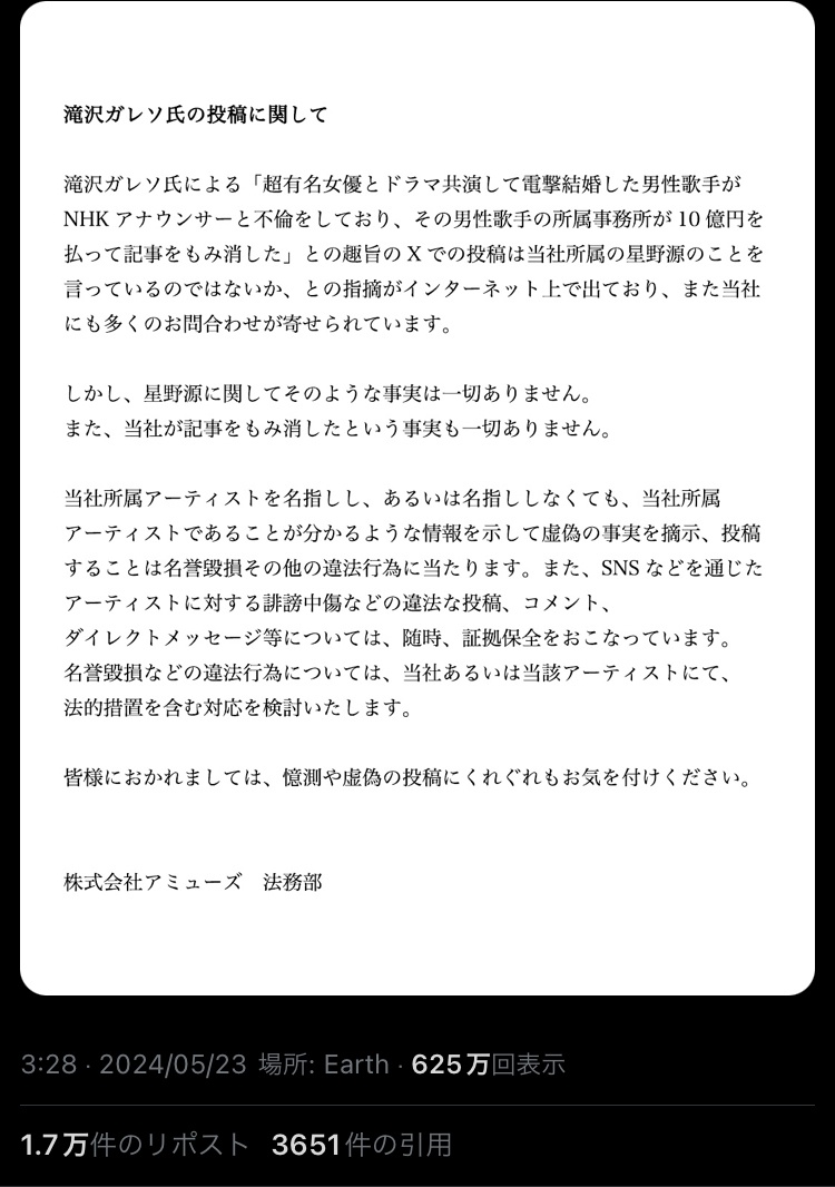 滝沢ガレソ、深夜3時半に星野源の事務所に声明を出させるwwwwwwwww