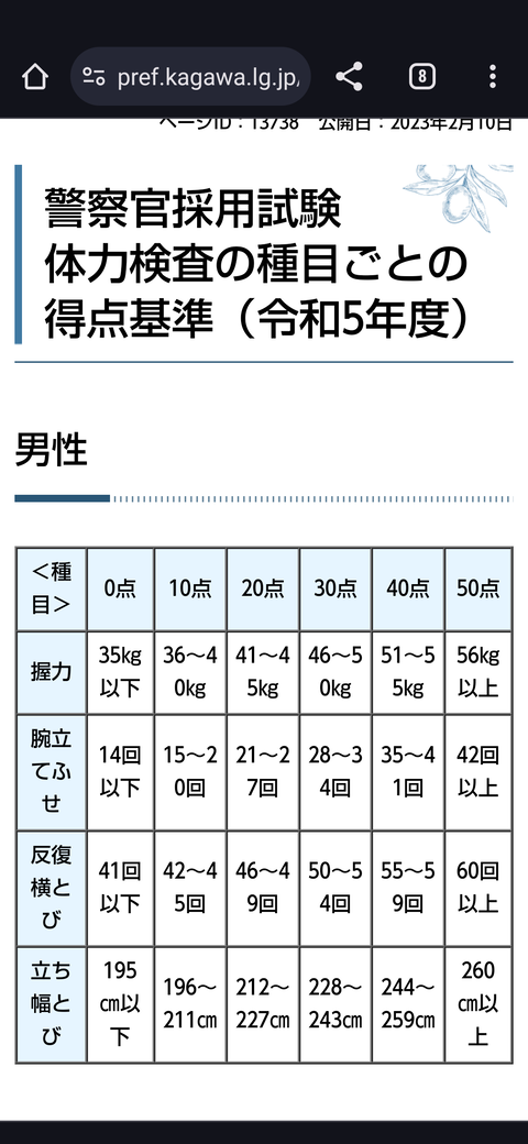 香川県警の体力試験や。50点未満は不合格らしいわ。