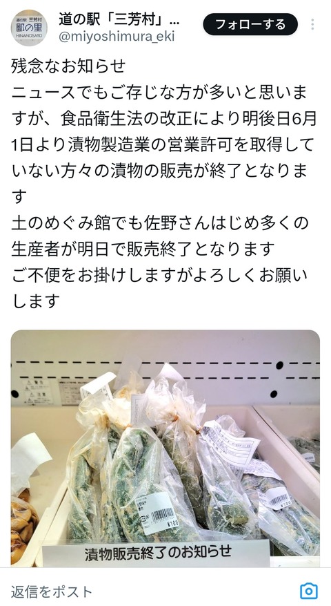【悲報】改正食品衛生法の影響で来月から道の駅などから許可を取らなかった個人の漬物や食品が消える模様…