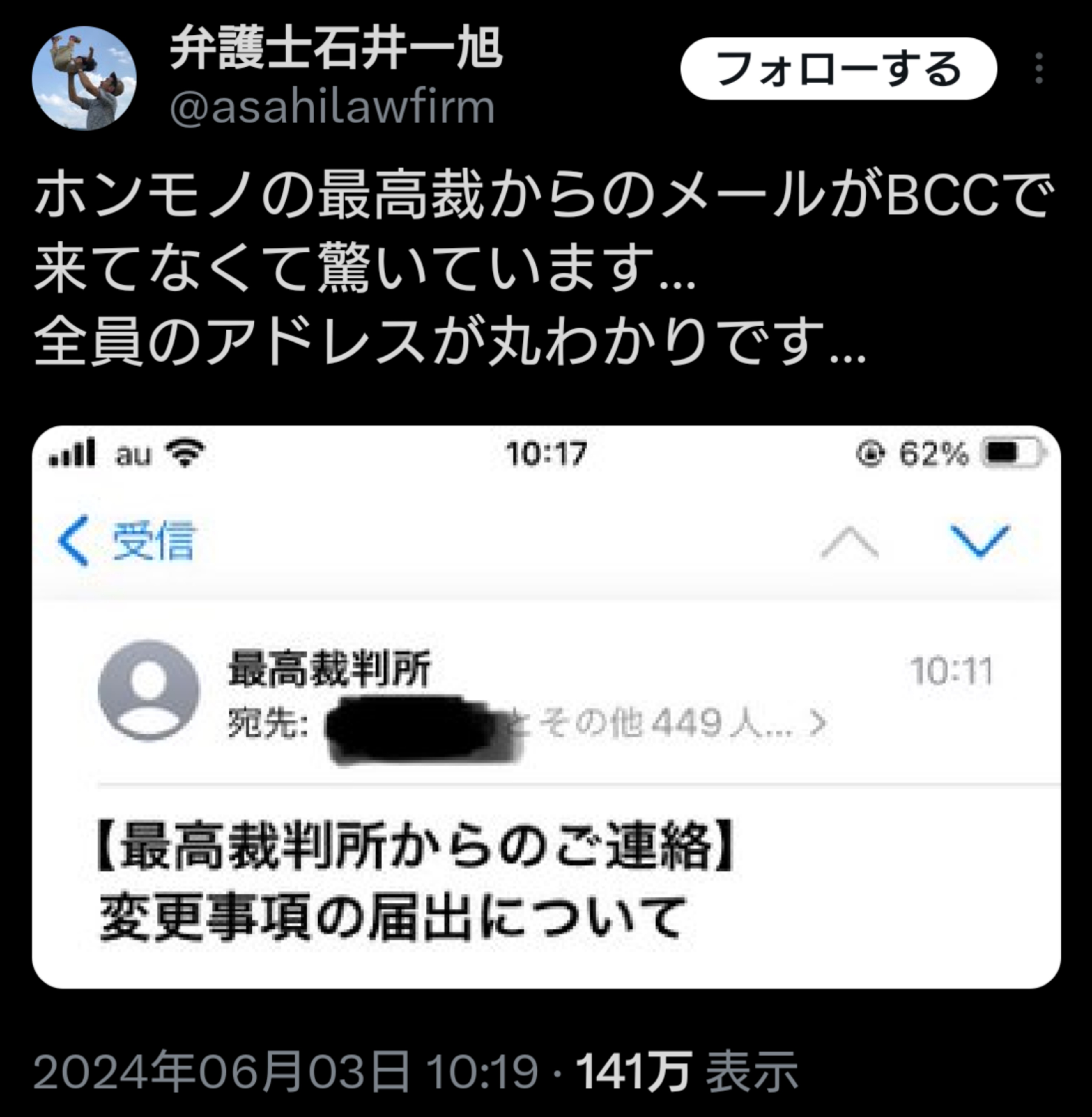 【悲報】最高裁さん、CCでメール送信。鳴潮ムーヴをかましてしまうwwwwww