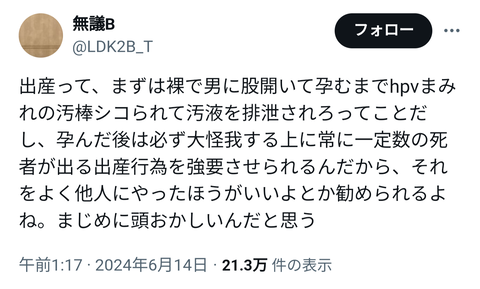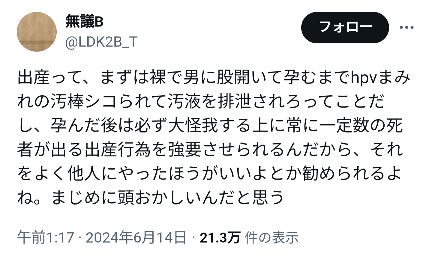 反出生フェミニストさん「出産…?それって汚棒でシ●らされて汚液を排泄されるってこと!?!?!?」
