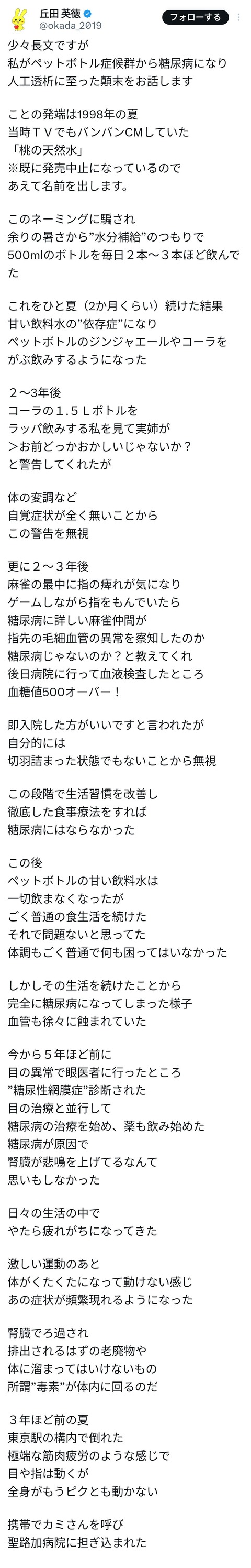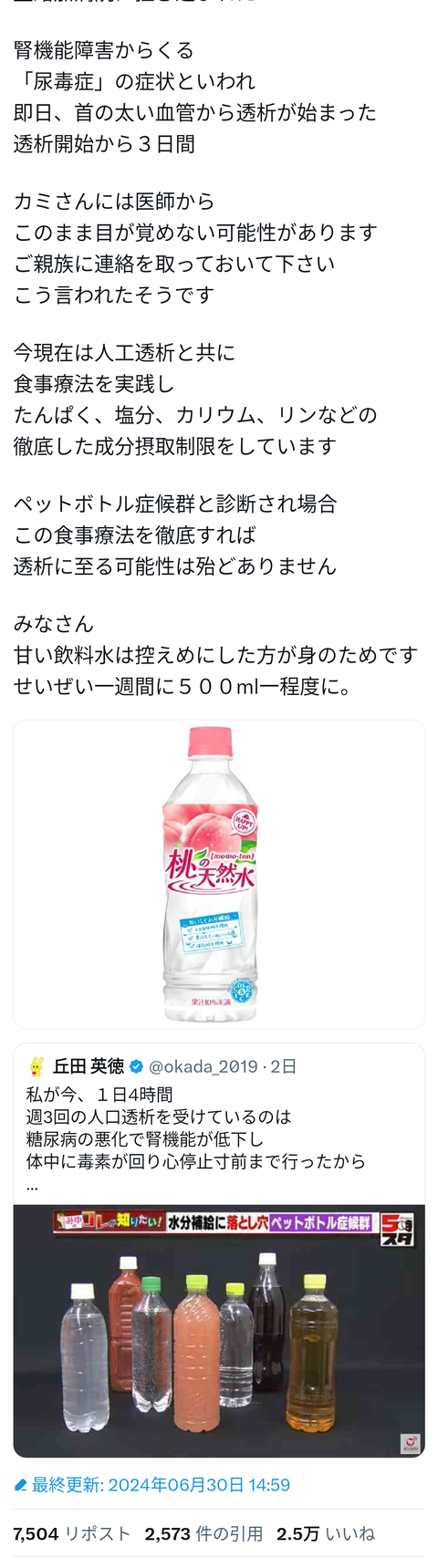 糖尿病患者「桃の天然水というネーミングに騙され人工透析に」😰