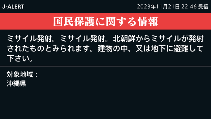 対象地域:沖縄県— 首相官邸(災害・危機管理情報) (@Kantei_Saigai) November 21, 2023
