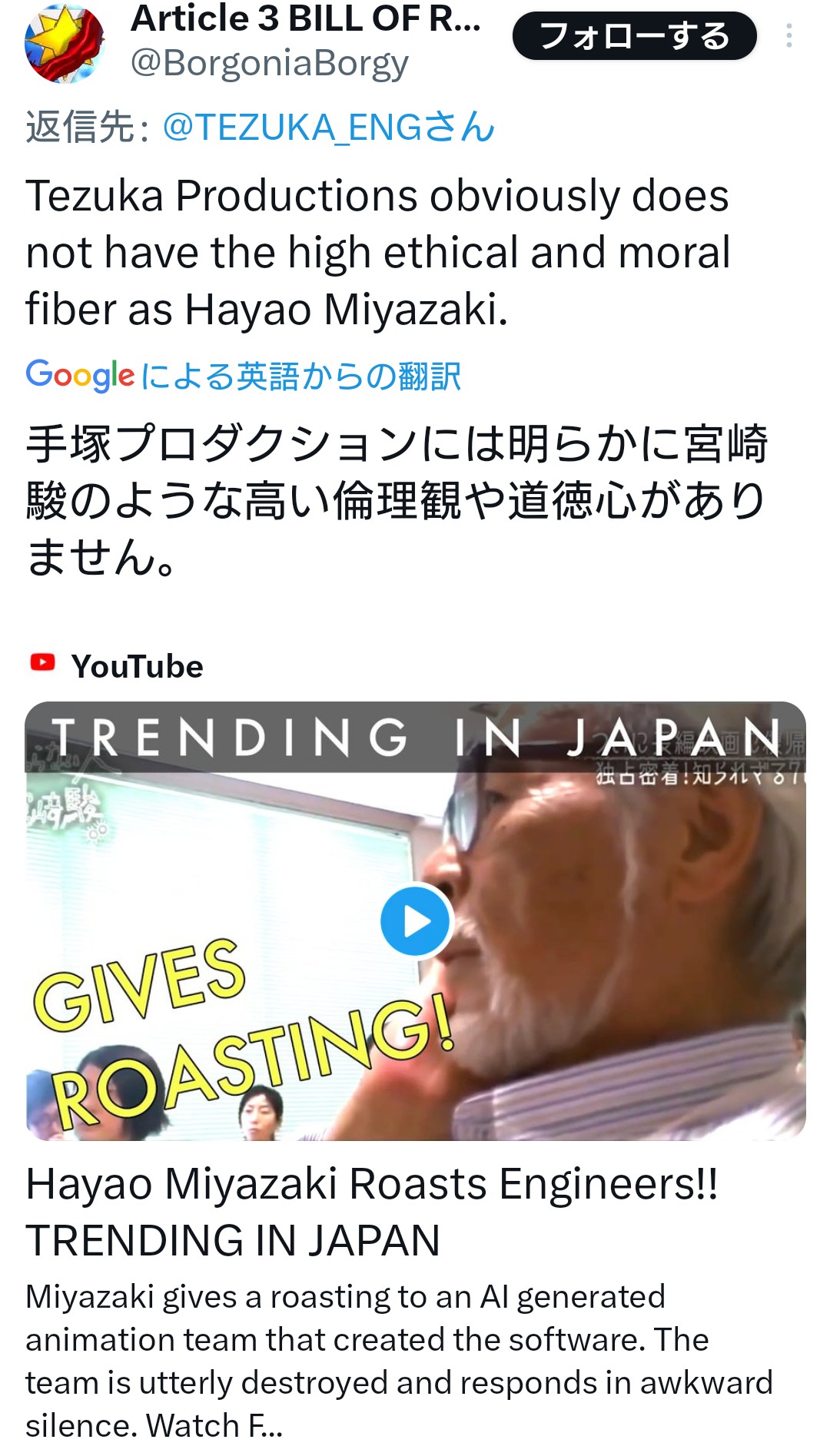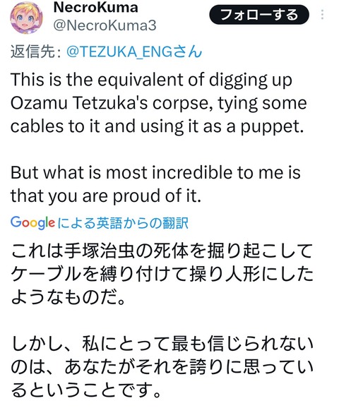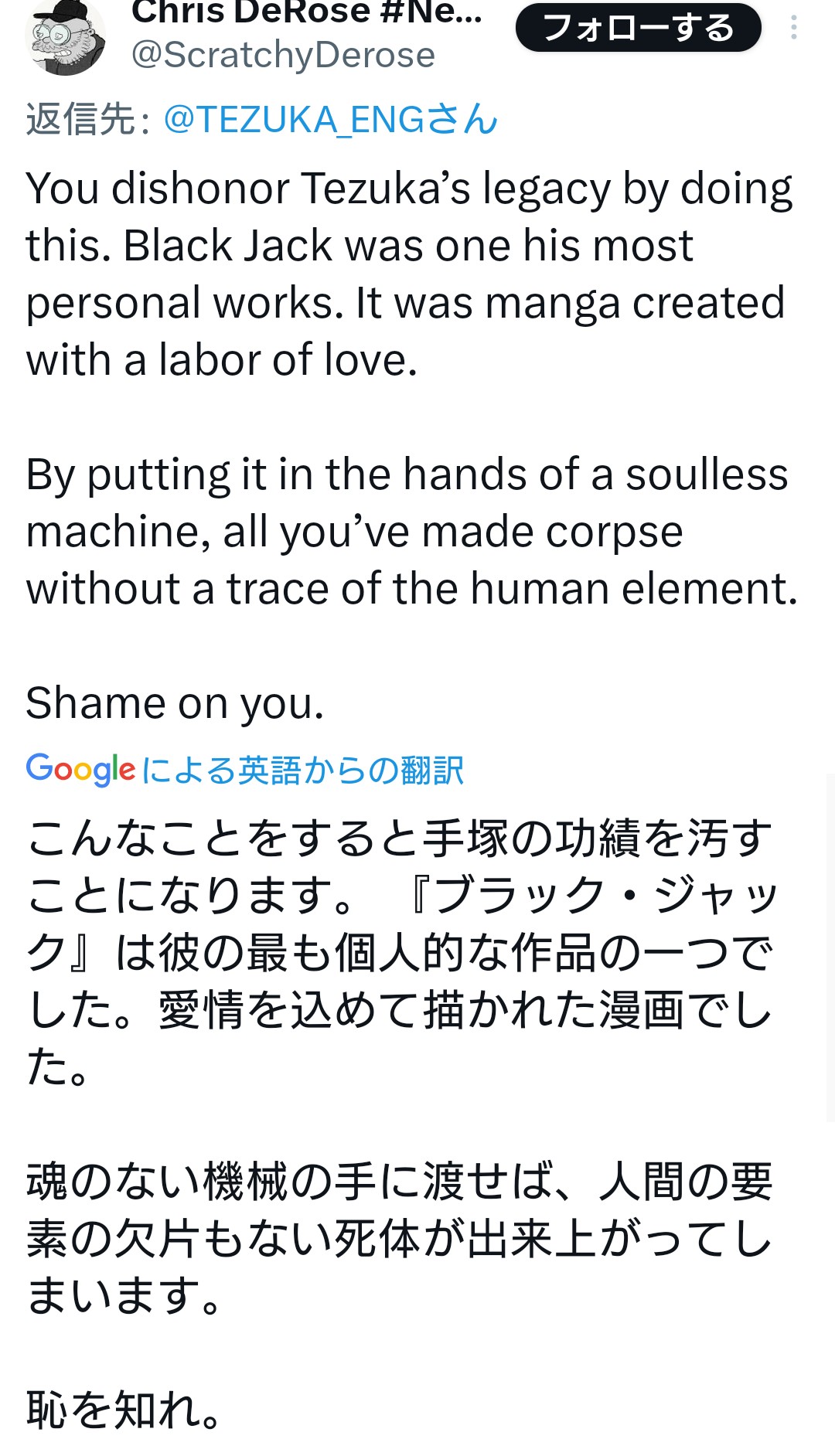 【朗報】AIブラックジャック、無事海外で大炎上wwwwwwwww 2023年11月22日 最終更新日時 : 2023年11月22日 loki.5ch.net カープドラ6西川篤夢!「日本を代表する遊撃手になりたい」【ドラフト会議2025】 カープドラ5赤木晴哉!191cm最速153キロ!佛教大の本格派右腕!【ドラフト会議2025】 カープドラ4工藤泰己!159キロ北の剛腕!【ドラフト会議2025】 カープドラ3勝田成!近畿大163cmセカンド!菊池涼介の後継者候補!【ドラフト会議2025】 カープドラ2齊藤汰直!亜大152キロエース!【ドラフト会議2025】 カープドラ1平川蓮!187cmのスイッチヒッター!立石正広を外し2度目の重複も新井監督がクジを引き当てる!【ドラフト会議2025】 【カープ実況】ドラフト会議2025!ドラ1立石正広の獲得なるか 緒方孝市カープドラ3指名で青学出禁!澤﨑俊和の逆指名まで10年間スカウト出禁 【朗報】広島、攻守最強都市だったwww 【悲報】彼女「ごめん!俺くんの貯金、情報商材に使っちゃった」→…問い詰めたらギャン泣きされたんだが俺が悪いのか? 【朗報】AIブラックジャック、無事海外で大炎上wwwwwwwww 1:それでも動く名無し:2023/11/22(水) 20:54:31.24 ID:/mGMgqeir 外人の方がよっぽどまともだわ 9:それでも動く名無し:2023/11/22(水) 20:56:46.53 ID:wVhkVPP+0 脳内手塚治虫の召喚合戦 12:それでも動く名無し:2023/11/22(水) 20:57:52.55 ID:tET5f/180 手塚て評価高いんだな 続きを読む 続きを見る カープドラ6西川篤夢!「日本を代表する遊撃手になりたい」【ドラフト会議2025】 カープドラ5赤木晴哉!191cm最速153キロ!佛教大の本格派右腕!【ドラフト会議2025】 カープドラ4工藤泰己!159キロ北の剛腕!【ドラフト会議2025】 カープドラ3勝田成!近畿大163cmセカンド!菊池涼介の後継者候補!【ドラフト会議2025】 カープドラ2齊藤汰直!亜大152キロエース!【ドラフト会議2025】 カープドラ1平川蓮!187cmのスイッチヒッター!立石正広を外し2度目の重複も新井監督がクジを引き当てる!【ドラフト会議2025】 【カープ実況】ドラフト会議2025!ドラ1立石正広の獲得なるか 緒方孝市カープドラ3指名で青学出禁!澤﨑俊和の逆指名まで10年間スカウト出禁 関連記事 関連記事はありません。