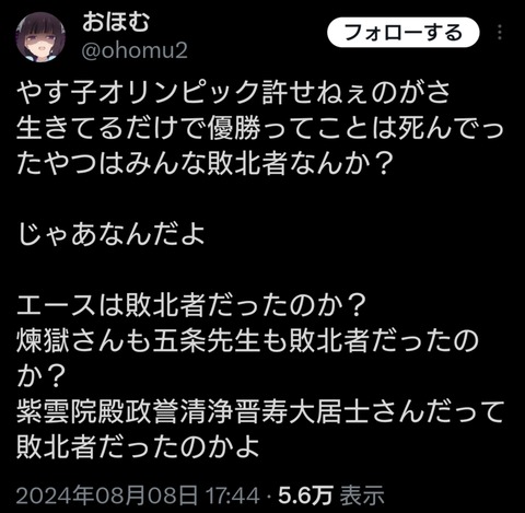ツイカス「やすこオリンピック許せねぇ!死んだやつはみんな敗北者なら安倍様も敗北者かよ」
