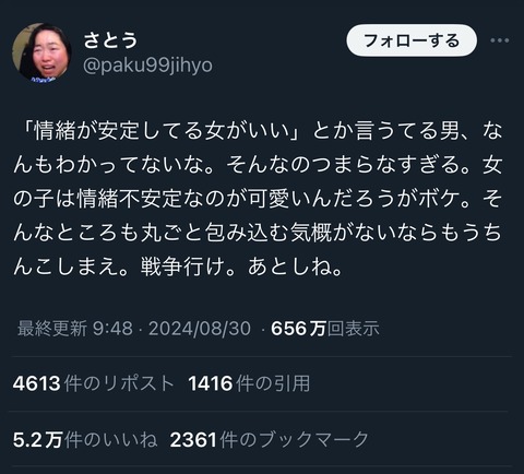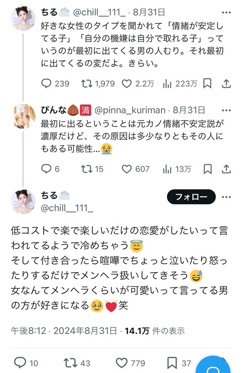 【悲報】女さん、「情緒が安定してる女」を求める男にブチギレwwwww