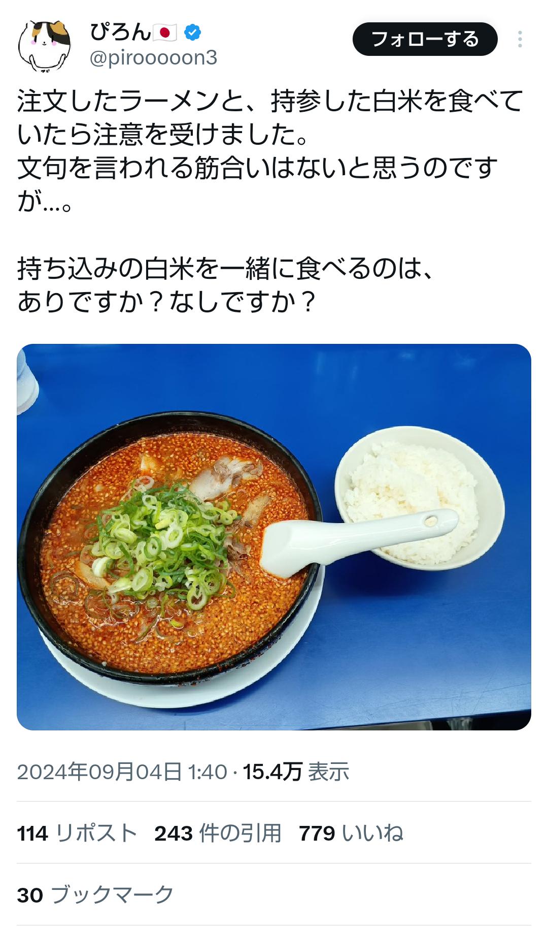 ネトウヨ「ラーメン店でラーメンと一緒に白米を食べてたら店主に怒られたけど何が悪いのか分からない」