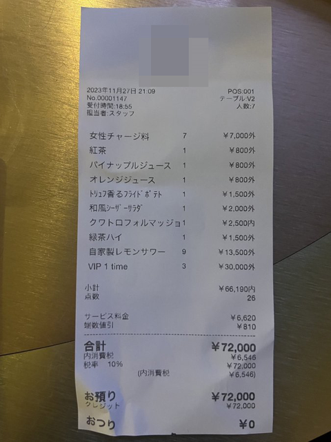 うれしのちゃんは店のInstagramアカウントのスクショだけでなく、27日付で発行されたレシートも公開。当日は7人で店を訪れたようで、レシート明細の一番上には「女性チャージ料」として「¥7,000外」との記載が。次に注文したドリンクやフードの明細が並び、末尾には“VIP扱いのチャージ料金”として「¥30,000外」と記されていた。合計金額は税込みで、「¥72,000」となったようだ。