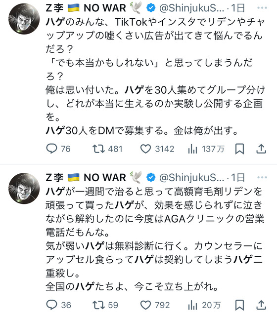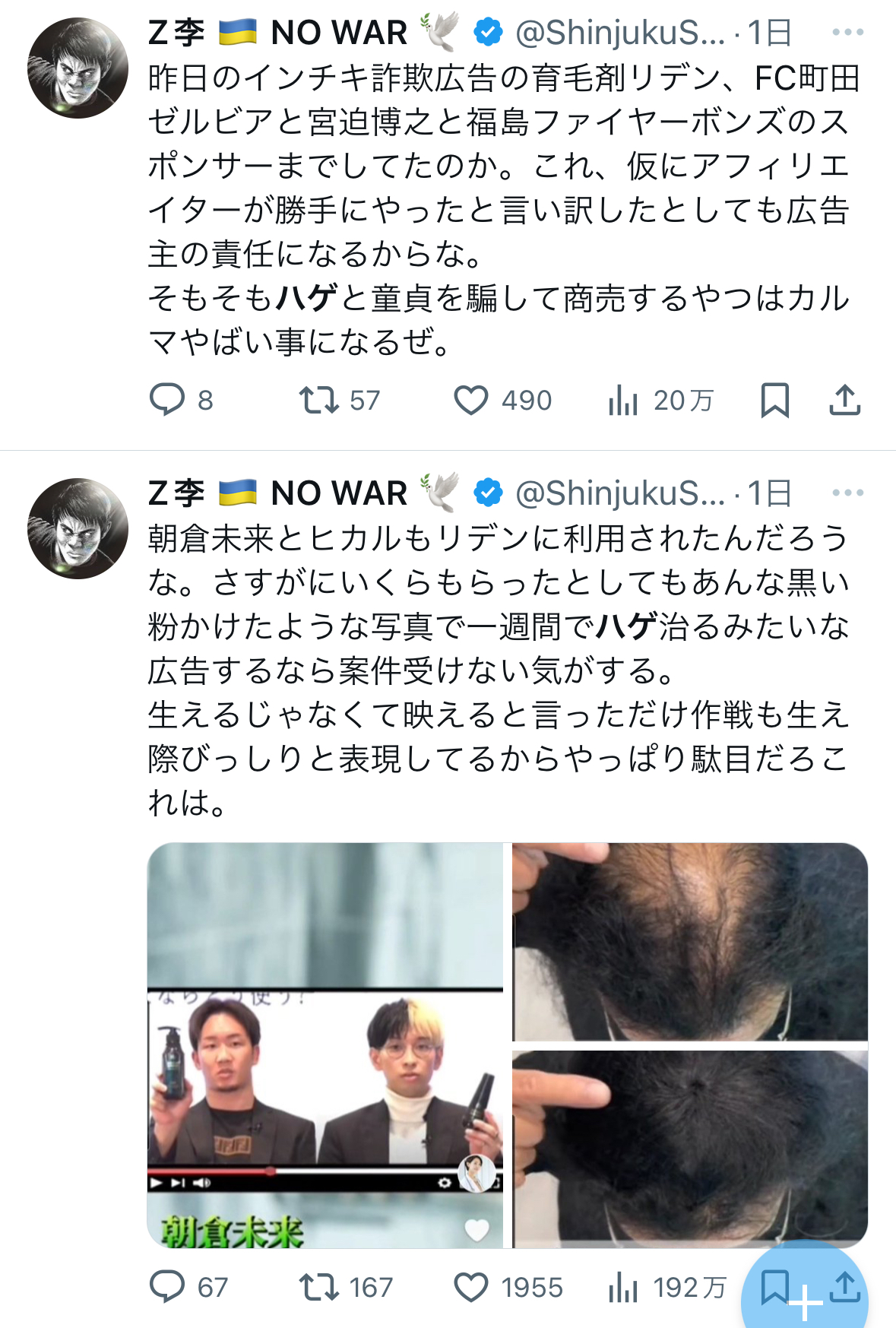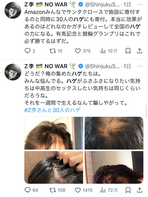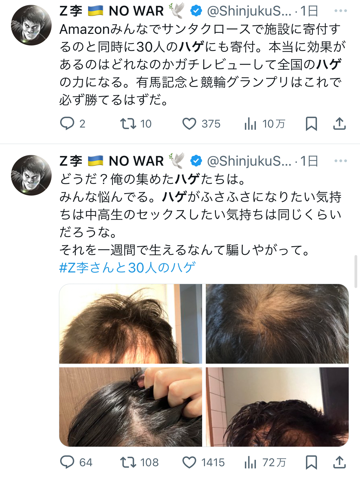 そもそもハゲと童貞を騙して商売するやつはカルマやばい事になるぜ。— Z李 ???? NO WAR ?? (@ShinjukuSokai) November 27, 2023