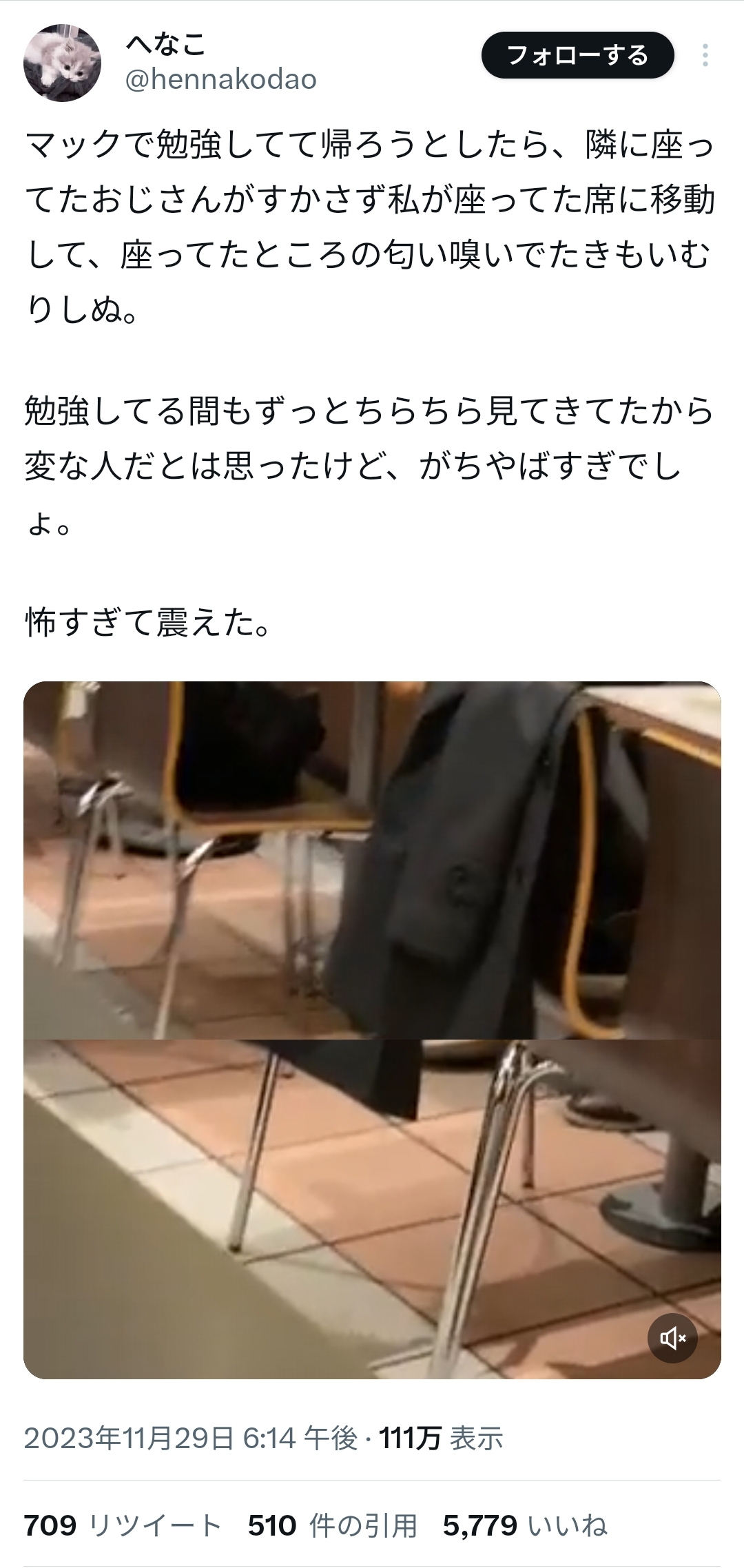 【動画】マックで女子高生が席を立った瞬間、席を移動しJKの座席の匂いを嗅ぐオッサンが撮影される