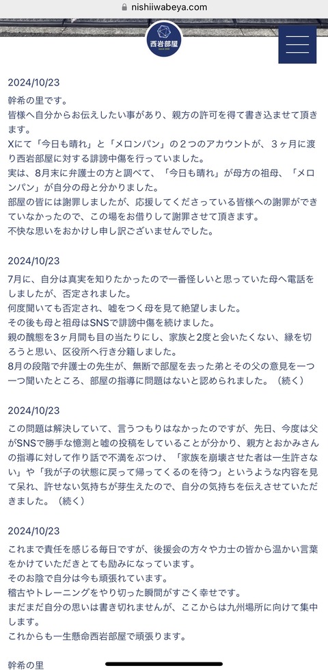 ちなみに誹謗中傷が原因かしらんけど西岩部屋は最近全てのSNSを閉鎖したらしい