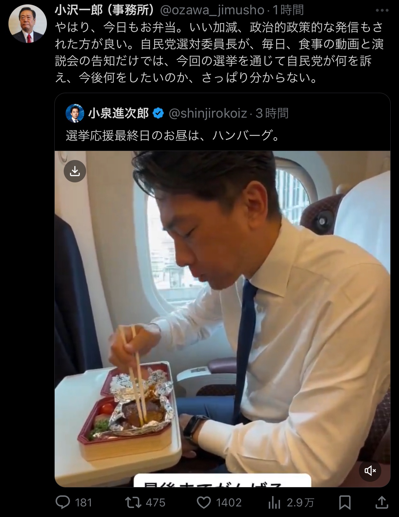 【悲報】小沢一郎、お弁当動画ばかり上げる進次郎に苦言wwwwwwwwww