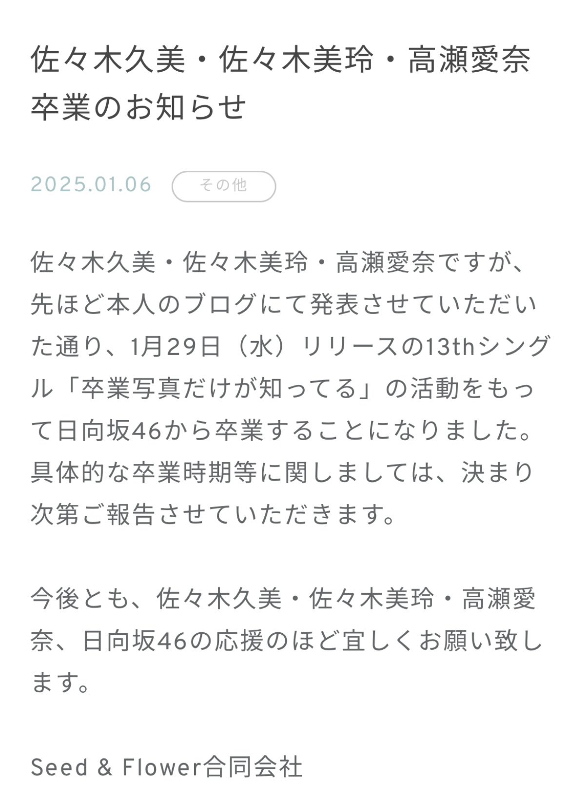 https://www.nikkansports.com/entertainment/news/202501060000639.html日向坂46の佐々木久美(28)佐々木美玲(25)高瀬愛奈(26)が6日、それぞれの公式ブログを更新し、グループからの卒業を発表した。1月29日発売の13枚目シングル「卒業写真だけが知ってる」の活動をもって卒業する。長年グループを支えてきた一期生全員が日向坂46を去ることとなった。
