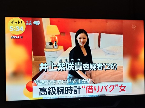 7日朝に目撃されたのは、うつむいた状態で警察署から送検される姿。男性から高級腕時計「ロレックス」を盗んだ疑いで井上紫咲貴(むらさき)が逮捕された。