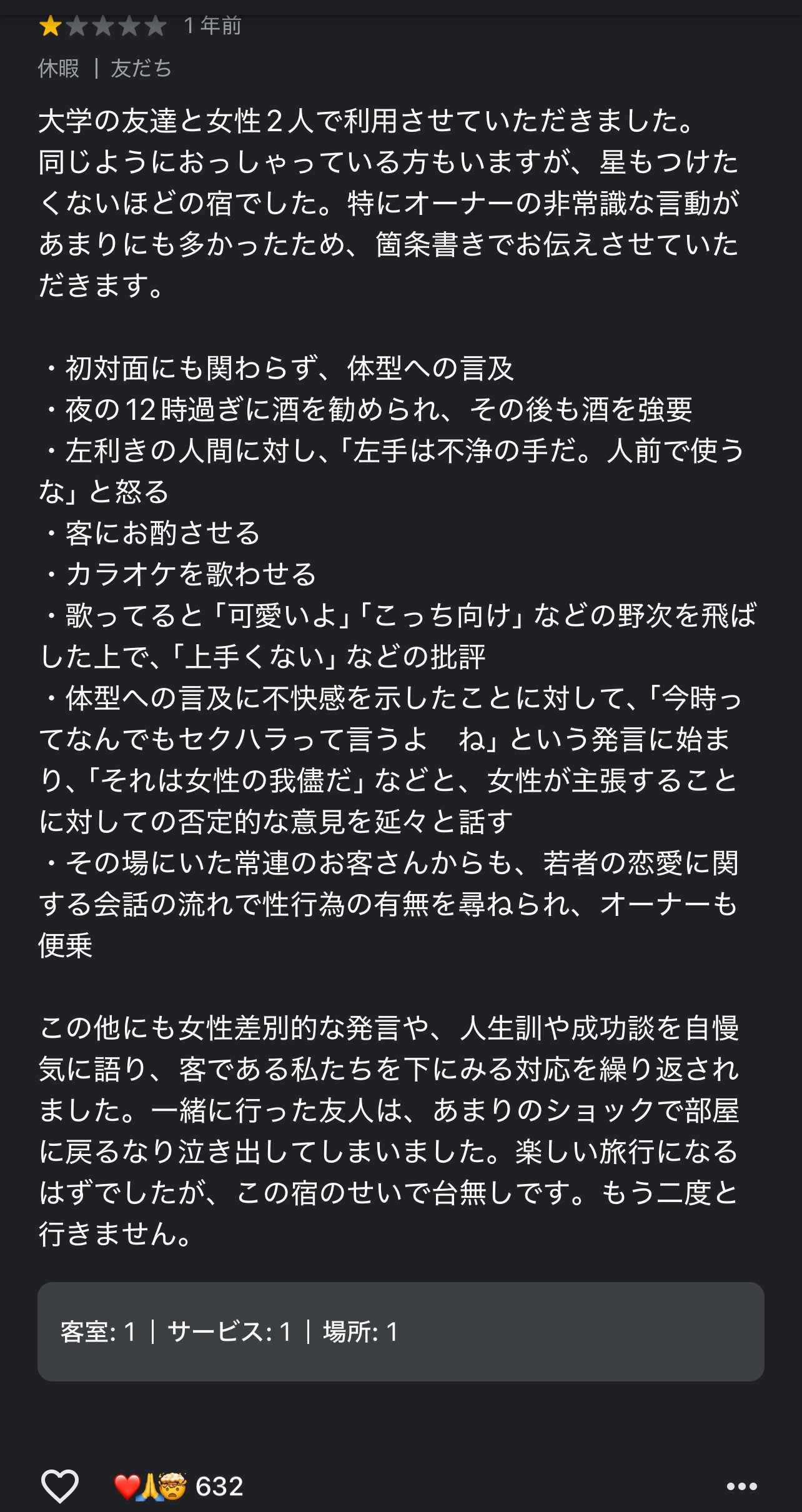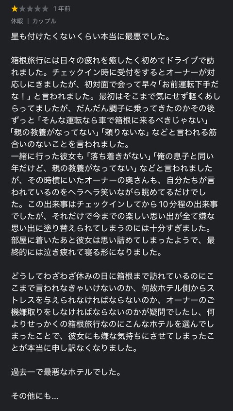 車で行くといきなり運転ディスりされる、若い女が行くとオーナーの晩酌に強制参加でお酌やカラオケを強要される、カップルで行くと性行為のことを集団で聞いてくる、等ボロボロ出てき過ぎワロタ