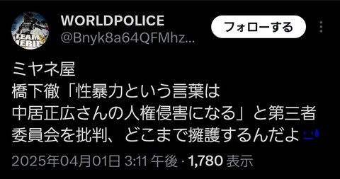橋下弁護士「性暴力という言葉は中居くんへの人権侵害」と中居正広氏を擁護 2025年4月1日 最終更新日時 : 2025年4月1日 loki.5ch.net カープドラ6西川篤夢!「日本を代表する遊撃手になりたい」【ドラフト会議2025】 カープドラ5赤木晴哉!191cm最速153キロ!佛教大の本格派右腕!【ドラフト会議2025】 カープドラ4工藤泰己!159キロ北の剛腕!【ドラフト会議2025】 カープドラ3勝田成!近畿大163cmセカンド!菊池涼介の後継者候補!【ドラフト会議2025】 カープドラ2齊藤汰直!亜大152キロエース!【ドラフト会議2025】 カープドラ1平川蓮!187cmのスイッチヒッター!立石正広を外し2度目の重複も新井監督がクジを引き当てる!【ドラフト会議2025】 【カープ実況】ドラフト会議2025!ドラ1立石正広の獲得なるか 緒方孝市カープドラ3指名で青学出禁!澤﨑俊和の逆指名まで10年間スカウト出禁 【朗報】広島、攻守最強都市だったwww 【悲報】彼女「ごめん!俺くんの貯金、情報商材に使っちゃった」→…問い詰めたらギャン泣きされたんだが俺が悪いのか? 橋下弁護士「性暴力という言葉は中居くんへの人権侵害」と中居正広氏を擁護 1:それでも動く名無し:2025/04/01(火) 18:41:54.78 ID:Nx6TV5A+0 さすが 3:それでも動く名無し:2025/04/01(火) 18:43:50.88 ID:tmVMrOg/0 じゃあ「強姦」で 5:それでも動く名無し:2025/04/01(火) 18:44:59.35 ID:FTBlqRMN0 じゃあ「監禁強姦傷害」で 続きを読む 続きを見る カープドラ6西川篤夢!「日本を代表する遊撃手になりたい」【ドラフト会議2025】 カープドラ5赤木晴哉!191cm最速153キロ!佛教大の本格派右腕!【ドラフト会議2025】 カープドラ4工藤泰己!159キロ北の剛腕!【ドラフト会議2025】 カープドラ3勝田成!近畿大163cmセカンド!菊池涼介の後継者候補!【ドラフト会議2025】 カープドラ2齊藤汰直!亜大152キロエース!【ドラフト会議2025】 カープドラ1平川蓮!187cmのスイッチヒッター!立石正広を外し2度目の重複も新井監督がクジを引き当てる!【ドラフト会議2025】 【カープ実況】ドラフト会議2025!ドラ1立石正広の獲得なるか 緒方孝市カープドラ3指名で青学出禁!澤﨑俊和の逆指名まで10年間スカウト出禁 関連記事 関連記事はありません。
