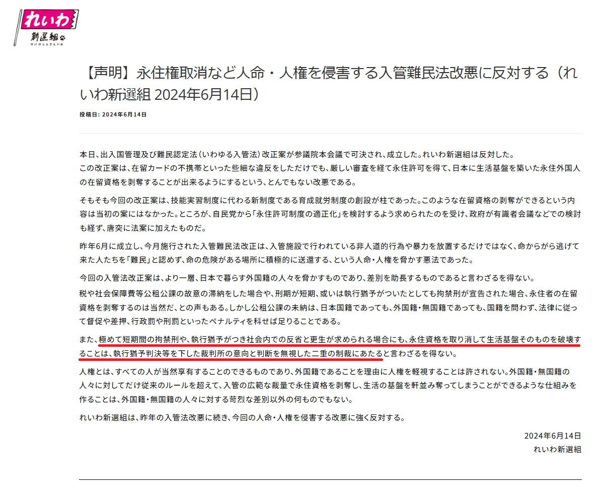 【炎上】れいわ新選組 「外国人から永住資格を取りあげるのは差別」
