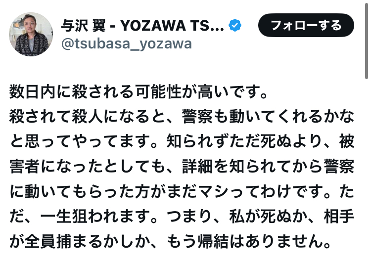 【悲報】与沢翼さん殺し屋に狙われている模様 2025年4月28日 最終更新日時 : 2025年4月28日 loki.5ch.net カープドラ6西川篤夢!「日本を代表する遊撃手になりたい」【ドラフト会議2025】 カープドラ5赤木晴哉!191cm最速153キロ!佛教大の本格派右腕!【ドラフト会議2025】 カープドラ4工藤泰己!159キロ北の剛腕!【ドラフト会議2025】 カープドラ3勝田成!近畿大163cmセカンド!菊池涼介の後継者候補!【ドラフト会議2025】 カープドラ2齊藤汰直!亜大152キロエース!【ドラフト会議2025】 カープドラ1平川蓮!187cmのスイッチヒッター!立石正広を外し2度目の重複も新井監督がクジを引き当てる!【ドラフト会議2025】 【カープ実況】ドラフト会議2025!ドラ1立石正広の獲得なるか 緒方孝市カープドラ3指名で青学出禁!澤﨑俊和の逆指名まで10年間スカウト出禁 【朗報】広島、攻守最強都市だったwww 【悲報】彼女「ごめん!俺くんの貯金、情報商材に使っちゃった」→…問い詰めたらギャン泣きされたんだが俺が悪いのか? 【悲報】与沢翼さん殺し屋に狙われている模様 1:それでも動く名無し:2025/04/28(月) 15:10:55.69 ID:tFR7QoZI0 防犯カメラ40個で対策するらしい 2:それでも動く名無し:2025/04/28(月) 15:12:21.68 ID:hy4wiXcP0 シャブ中の症状で草 3:それでも動く名無し:2025/04/28(月) 15:12:57.62 ID:byB/JhBi0 おっさんなのに中学生みたいな顔してるな 続きを読む 続きを見る カープドラ6西川篤夢!「日本を代表する遊撃手になりたい」【ドラフト会議2025】 カープドラ5赤木晴哉!191cm最速153キロ!佛教大の本格派右腕!【ドラフト会議2025】 カープドラ4工藤泰己!159キロ北の剛腕!【ドラフト会議2025】 カープドラ3勝田成!近畿大163cmセカンド!菊池涼介の後継者候補!【ドラフト会議2025】 カープドラ2齊藤汰直!亜大152キロエース!【ドラフト会議2025】 カープドラ1平川蓮!187cmのスイッチヒッター!立石正広を外し2度目の重複も新井監督がクジを引き当てる!【ドラフト会議2025】 【カープ実況】ドラフト会議2025!ドラ1立石正広の獲得なるか 緒方孝市カープドラ3指名で青学出禁!澤﨑俊和の逆指名まで10年間スカウト出禁 関連記事 関連記事はありません。