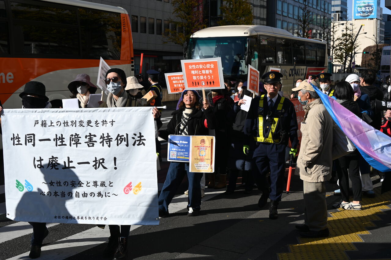 戸籍上の性別変更を可能にした性同一性障害特例法の廃止を訴えるデモ活動が23日、東京・新宿で行われ、参加者の女性らが「性別は変えられない」「女性の尊厳を守れ」「性別は気持ちではない」などと訴えた。現場では、心と体の性別が一致しないトランスジェンダーが性別を変更する権利が脅かされるとしてデモ活動を妨害する人々も現れ、休日の繁華街で聞くに堪えない罵詈雑言を浴びせていた。