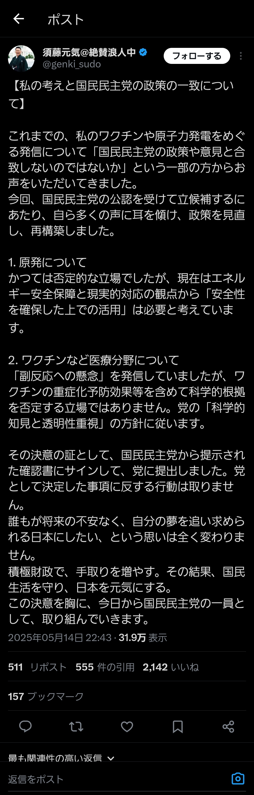【朗報】国民民主党に公認された須藤元気さん、改心するwwwwwwwwww