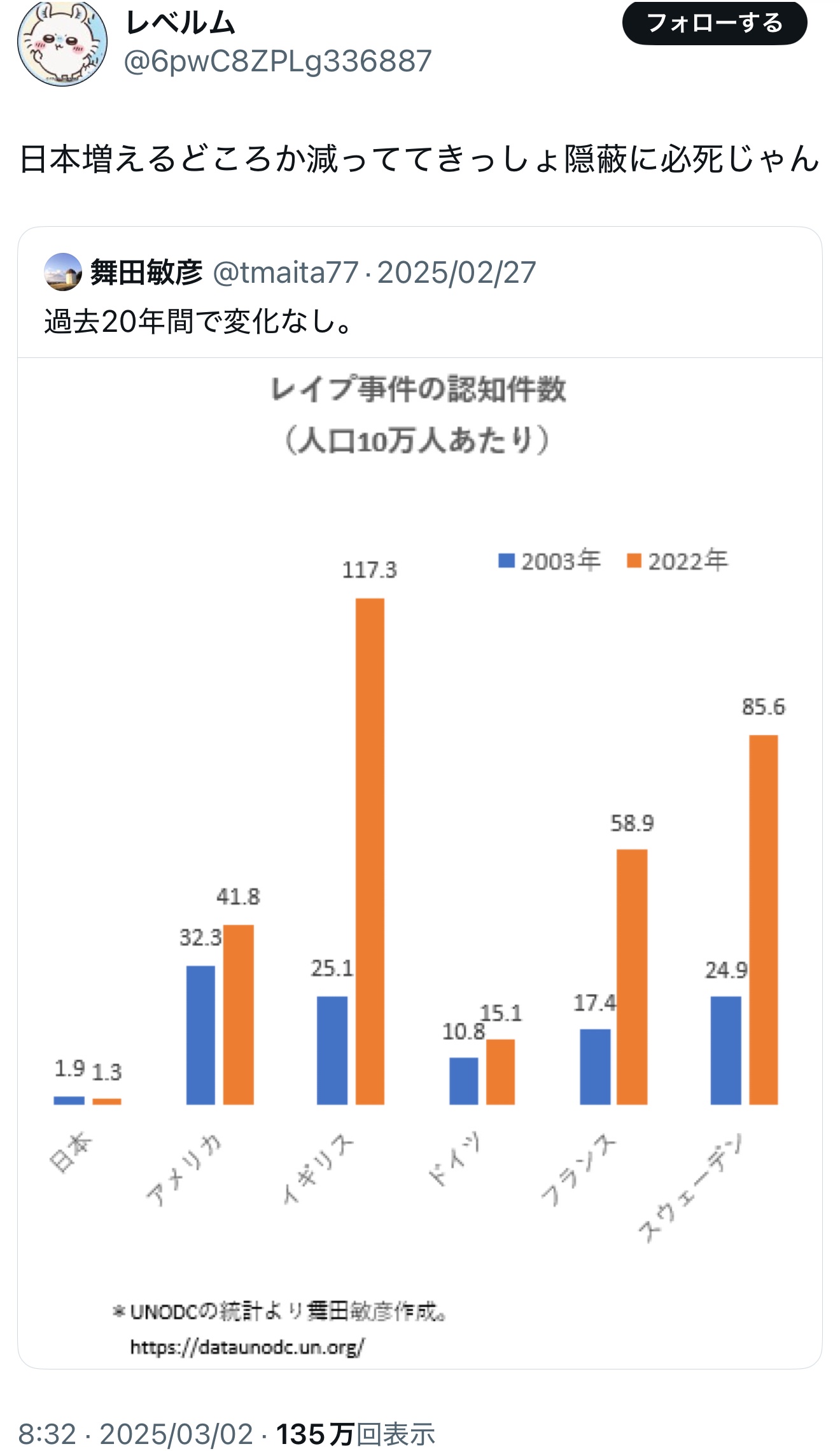 【意外】女さん「強姦件数減ってるじゃん!キッショ!」強姦してほしいってこと? 2025年5月24日 最終更新日時 : 2025年5月24日 loki.5ch.net カープドラ6西川篤夢!「日本を代表する遊撃手になりたい」【ドラフト会議2025】 カープドラ5赤木晴哉!191cm最速153キロ!佛教大の本格派右腕!【ドラフト会議2025】 カープドラ4工藤泰己!159キロ北の剛腕!【ドラフト会議2025】 カープドラ3勝田成!近畿大163cmセカンド!菊池涼介の後継者候補!【ドラフト会議2025】 カープドラ2齊藤汰直!亜大152キロエース!【ドラフト会議2025】 カープドラ1平川蓮!187cmのスイッチヒッター!立石正広を外し2度目の重複も新井監督がクジを引き当てる!【ドラフト会議2025】 【カープ実況】ドラフト会議2025!ドラ1立石正広の獲得なるか 緒方孝市カープドラ3指名で青学出禁!澤﨑俊和の逆指名まで10年間スカウト出禁 【朗報】広島、攻守最強都市だったwww 【悲報】彼女「ごめん!俺くんの貯金、情報商材に使っちゃった」→…問い詰めたらギャン泣きされたんだが俺が悪いのか? 【意外】女さん「強姦件数減ってるじゃん!キッショ!」強姦してほしいってこと? 1:それでも動く名無し:2025/05/23(金) 07:51:33.19 ID:/HCqNj/Y0 2:それでも動く名無し:2025/05/23(金) 07:52:45.39 ID:82k3BCos0 隠蔽してるって意見なんだから強姦してほしいなんて話ではないやろ 続きを読む 続きを見る カープドラ6西川篤夢!「日本を代表する遊撃手になりたい」【ドラフト会議2025】 カープドラ5赤木晴哉!191cm最速153キロ!佛教大の本格派右腕!【ドラフト会議2025】 カープドラ4工藤泰己!159キロ北の剛腕!【ドラフト会議2025】 カープドラ3勝田成!近畿大163cmセカンド!菊池涼介の後継者候補!【ドラフト会議2025】 カープドラ2齊藤汰直!亜大152キロエース!【ドラフト会議2025】 カープドラ1平川蓮!187cmのスイッチヒッター!立石正広を外し2度目の重複も新井監督がクジを引き当てる!【ドラフト会議2025】 【カープ実況】ドラフト会議2025!ドラ1立石正広の獲得なるか 緒方孝市カープドラ3指名で青学出禁!澤﨑俊和の逆指名まで10年間スカウト出禁 関連記事 関連記事はありません。