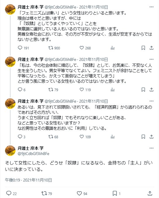 自分の考えにそぐわない女性のことを「奴隷」だの「家畜」だの罵倒してた奴だしフェミニスト(笑)何だよそもそも