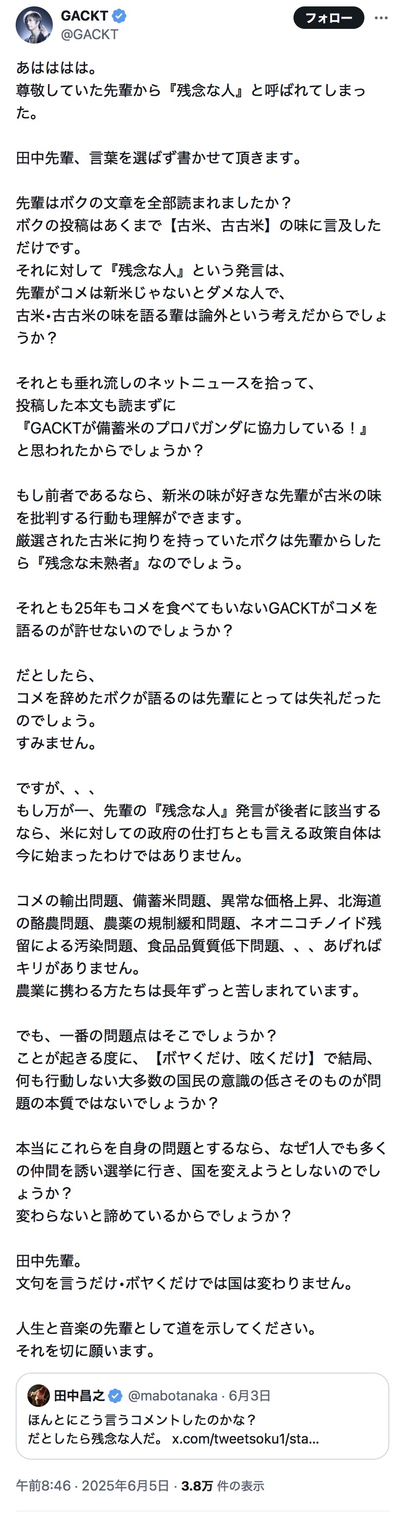 GACKT、「残念な人」と言われた事に長文でお気持ち表明wwwwwwwww