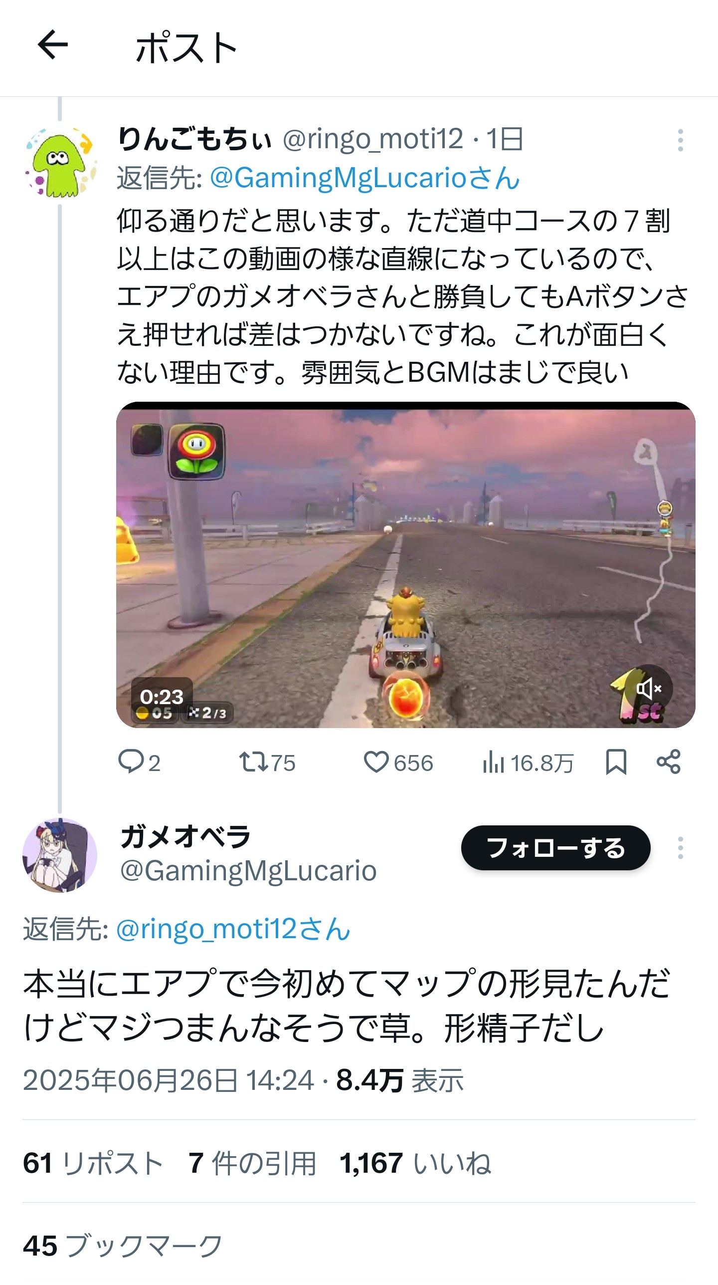 【悲報】『マリオカート ワールド』さん、精子みたいなコースを走らされて終わるwwwww 2025年6月29日 最終更新日時 : 2025年6月29日 loki.5ch.net カープドラ6西川篤夢!「日本を代表する遊撃手になりたい」【ドラフト会議2025】 カープドラ5赤木晴哉!191cm最速153キロ!佛教大の本格派右腕!【ドラフト会議2025】 カープドラ4工藤泰己!159キロ北の剛腕!【ドラフト会議2025】 カープドラ3勝田成!近畿大163cmセカンド!菊池涼介の後継者候補!【ドラフト会議2025】 カープドラ2齊藤汰直!亜大152キロエース!【ドラフト会議2025】 カープドラ1平川蓮!187cmのスイッチヒッター!立石正広を外し2度目の重複も新井監督がクジを引き当てる!【ドラフト会議2025】 【カープ実況】ドラフト会議2025!ドラ1立石正広の獲得なるか 緒方孝市カープドラ3指名で青学出禁!澤﨑俊和の逆指名まで10年間スカウト出禁 【朗報】広島、攻守最強都市だったwww 【悲報】彼女「ごめん!俺くんの貯金、情報商材に使っちゃった」→…問い詰めたらギャン泣きされたんだが俺が悪いのか? 【悲報】『マリオカート ワールド』さん、精子みたいなコースを走らされて終わるwwwww 1:それでも動く名無し:2025/06/27(金) 16:03:46.04 ID:Br1oPQQ30 2:それでも動く名無し:2025/06/27(金) 16:03:57.40 ID:Br1oPQQ30 プレイ動画 https://video.twimg.com/amplify_video/1938104082159570944/vid/avc1/1280×720/zJgaxk95YvqH0G1i.mp4?tag=14 5:それでも動く名無し:2025/06/27(金) 16:04:58.97 ID:j149Pl9K0 子宮みたいなコースも作れ 続きを読む 続きを見る カープドラ6西川篤夢!「日本を代表する遊撃手になりたい」【ドラフト会議2025】 カープドラ5赤木晴哉!191cm最速153キロ!佛教大の本格派右腕!【ドラフト会議2025】 カープドラ4工藤泰己!159キロ北の剛腕!【ドラフト会議2025】 カープドラ3勝田成!近畿大163cmセカンド!菊池涼介の後継者候補!【ドラフト会議2025】 カープドラ2齊藤汰直!亜大152キロエース!【ドラフト会議2025】 カープドラ1平川蓮!187cmのスイッチヒッター!立石正広を外し2度目の重複も新井監督がクジを引き当てる!【ドラフト会議2025】 【カープ実況】ドラフト会議2025!ドラ1立石正広の獲得なるか 緒方孝市カープドラ3指名で青学出禁!澤﨑俊和の逆指名まで10年間スカウト出禁 関連記事 関連記事はありません。