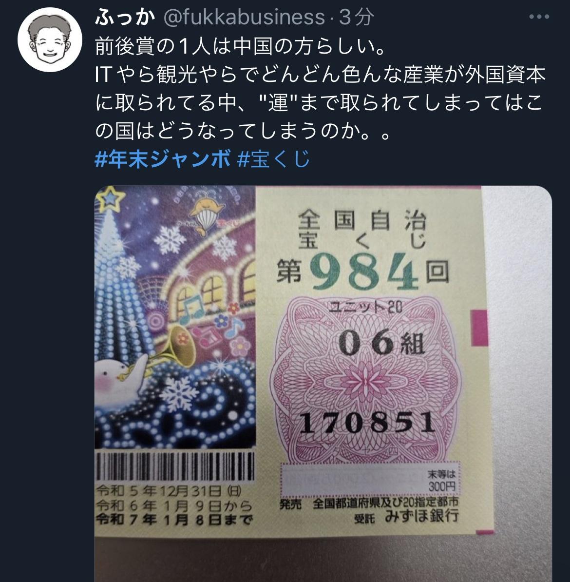 年末ジャンボ、謎の中国人が当選。「シンサンアリガトネ!😁」 2024年1月1日 最終更新日時 : 2024年1月1日 loki.5ch.net カープドラ6西川篤夢!「日本を代表する遊撃手になりたい」【ドラフト会議2025】 カープドラ5赤木晴哉!191cm最速153キロ!佛教大の本格派右腕!【ドラフト会議2025】 カープドラ4工藤泰己!159キロ北の剛腕!【ドラフト会議2025】 カープドラ3勝田成!近畿大163cmセカンド!菊池涼介の後継者候補!【ドラフト会議2025】 カープドラ2齊藤汰直!亜大152キロエース!【ドラフト会議2025】 カープドラ1平川蓮!187cmのスイッチヒッター!立石正広を外し2度目の重複も新井監督がクジを引き当てる!【ドラフト会議2025】 【カープ実況】ドラフト会議2025!ドラ1立石正広の獲得なるか 緒方孝市カープドラ3指名で青学出禁!澤﨑俊和の逆指名まで10年間スカウト出禁 【朗報】広島、攻守最強都市だったwww 【悲報】彼女「ごめん!俺くんの貯金、情報商材に使っちゃった」→…問い詰めたらギャン泣きされたんだが俺が悪いのか? 年末ジャンボ、謎の中国人が当選。「シンサンアリガトネ!😁」 1:以下、?ちゃんねるからVIPがお送りします:2023/12/31(日) 22:49:22.870 ID:ZHp36pYE0 2:以下、?ちゃんねるからVIPがお送りします:2023/12/31(日) 22:50:05.996 ID:xldItSBhd これもう海外貢献だろ 3:以下、?ちゃんねるからVIPがお送りします:2023/12/31(日) 22:50:47.093 ID:S0PcdBOB0 夢も希望も無いな 続きを読む 続きを見る カープドラ6西川篤夢!「日本を代表する遊撃手になりたい」【ドラフト会議2025】 カープドラ5赤木晴哉!191cm最速153キロ!佛教大の本格派右腕!【ドラフト会議2025】 カープドラ4工藤泰己!159キロ北の剛腕!【ドラフト会議2025】 カープドラ3勝田成!近畿大163cmセカンド!菊池涼介の後継者候補!【ドラフト会議2025】 カープドラ2齊藤汰直!亜大152キロエース!【ドラフト会議2025】 カープドラ1平川蓮!187cmのスイッチヒッター!立石正広を外し2度目の重複も新井監督がクジを引き当てる!【ドラフト会議2025】 【カープ実況】ドラフト会議2025!ドラ1立石正広の獲得なるか 緒方孝市カープドラ3指名で青学出禁!澤﨑俊和の逆指名まで10年間スカウト出禁 関連記事 関連記事はありません。