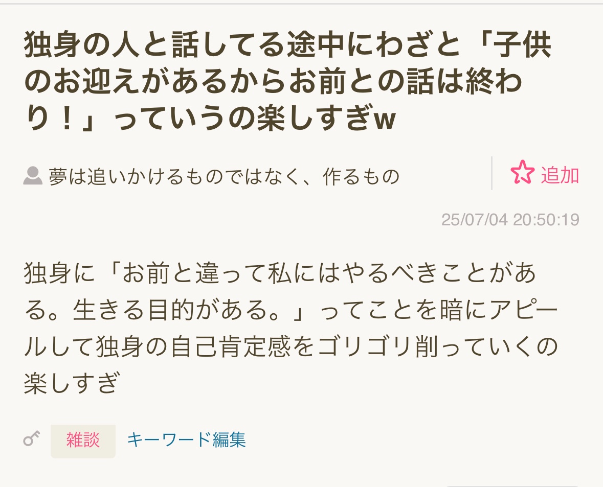独身の人と話してる途中にわざと「子供のお迎えがあるからお前との話は終わり!」っていうの楽しすぎw
