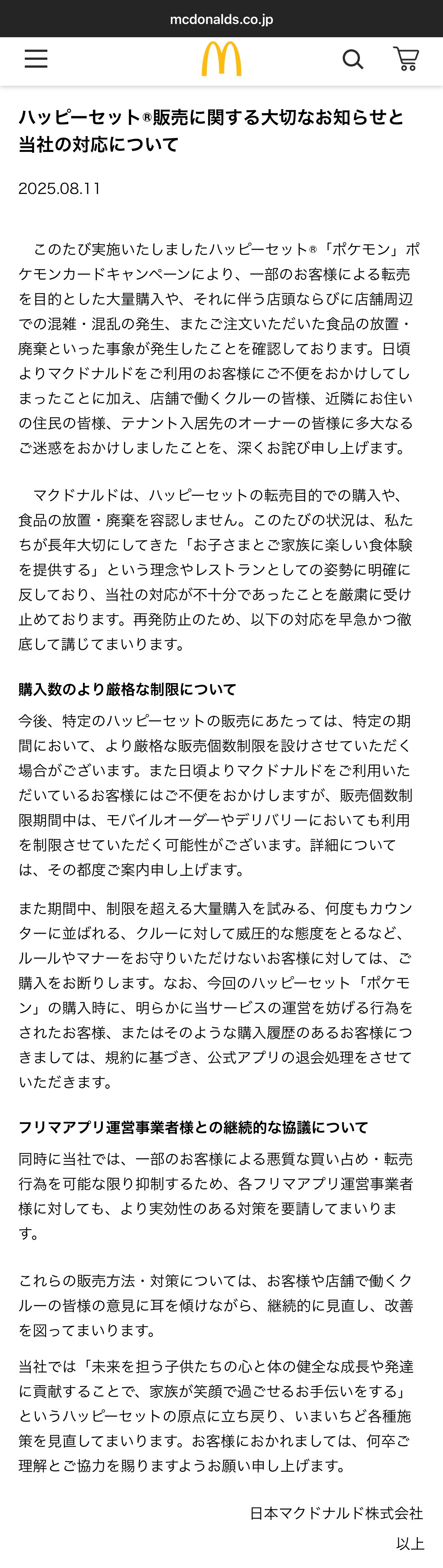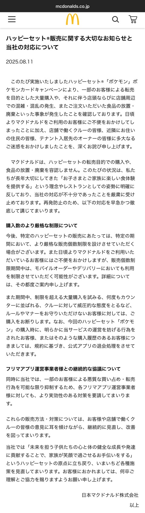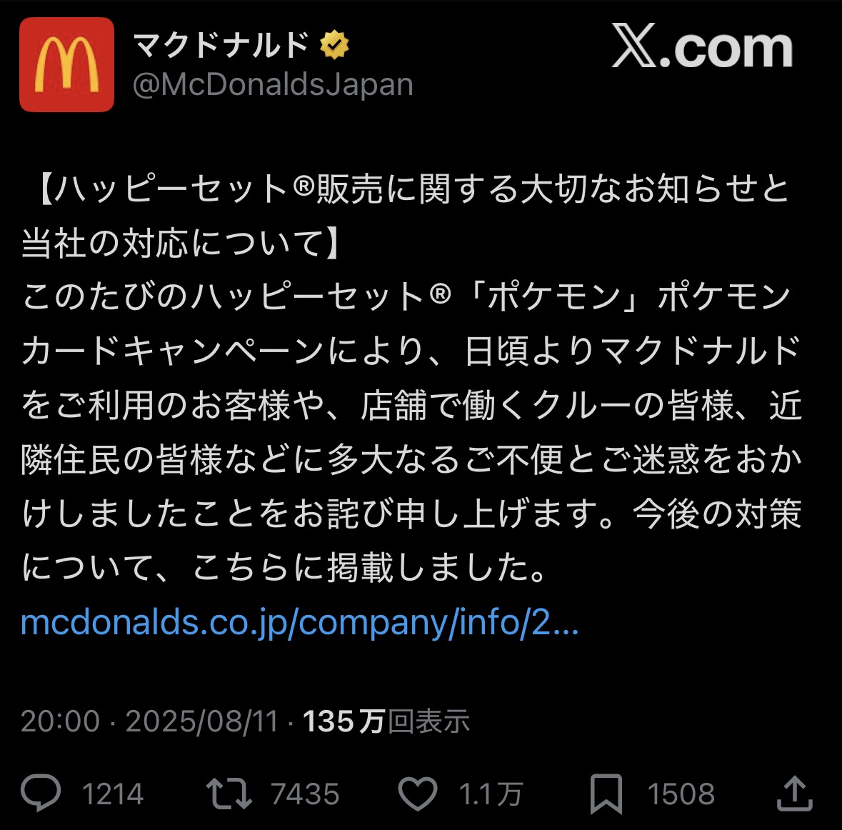 【画像】マクドナルドさん、ポケカハッピーセット騒動をガチ謝罪するも炎上がおさまらないwwwwwwwwwwwwwwwwwwww
